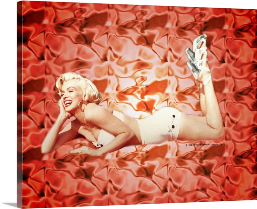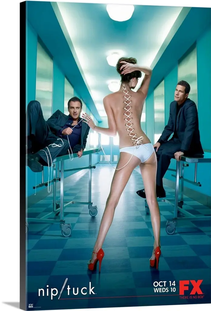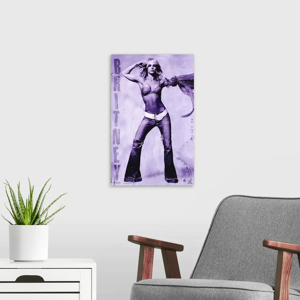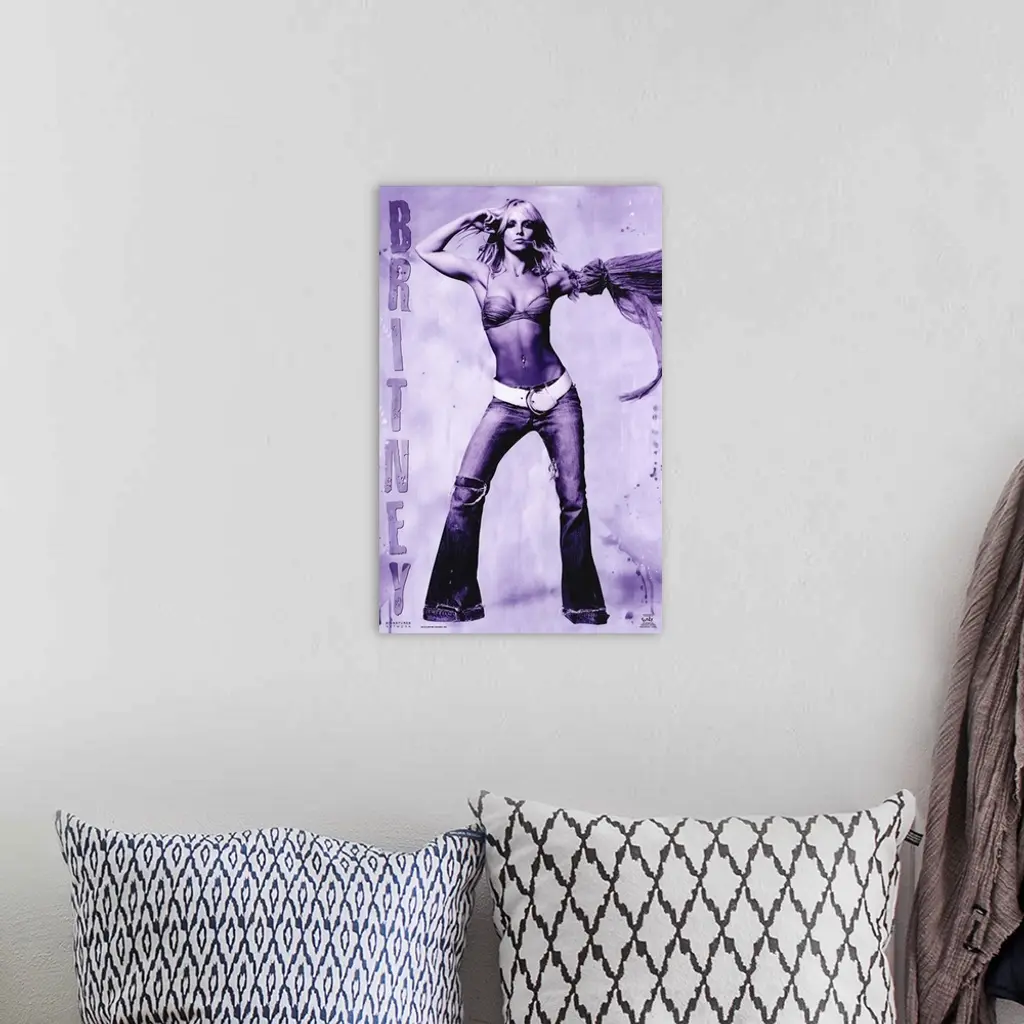 Oversized, vertical music poster on a wall hanging of Britney Spears, standing with arms raised, in tight, bell bottom jeans and a bikini top, her first name extends vertically on her left.