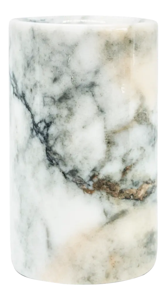Bursting with dynamic light and dark color variations, the Brix Wine Chiller serves up sculptural drama. Made from grey Levanto marble, polished cylinder form leads to a slimming, tapered foot. An ideal hostess giftand ready for your own bottle at home. Every chiller will be unique, as marble will vary in color and veining. CB2 exclusive.