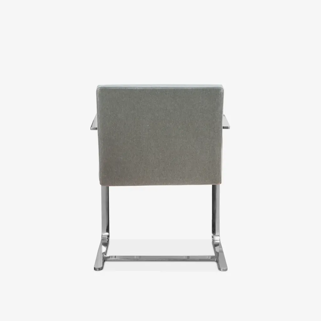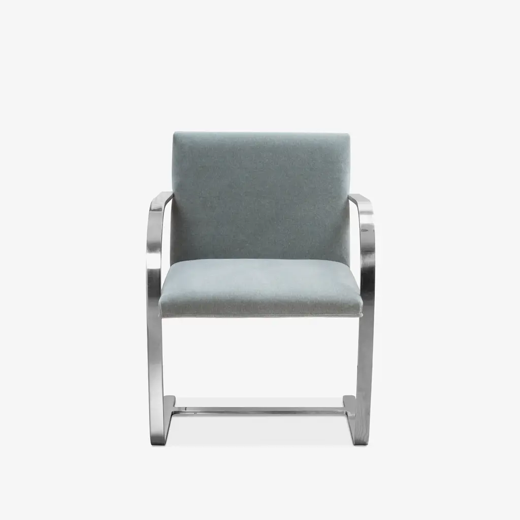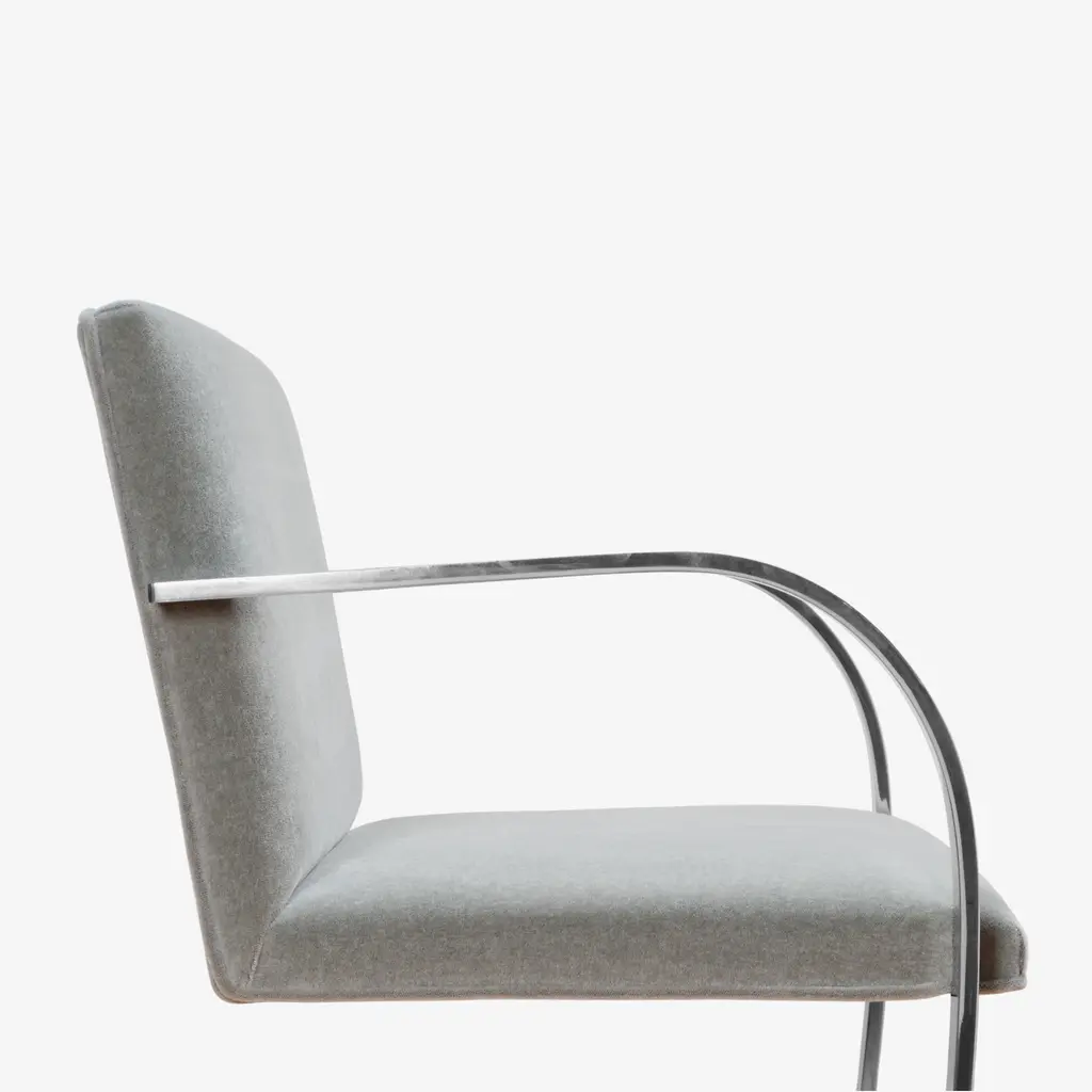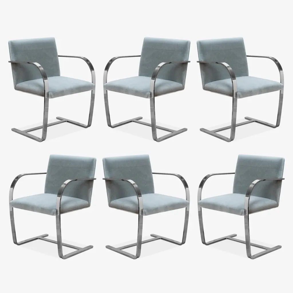 It is often said that modern design is timeless, this is unequivocally true with the Brno Chair, possibly one of the most iconic pieces of design in existence. Its designer, the great Ludwig Mies van der Rohe, could very well be known as one of the founding fathers of the Mid-Century Modern design movement. His work is deeply rooted in the Bauhaus from which this chair came to be. Only Mies van der Rohe, with his sage-like mastery of minimalism, could have consistently produced work still relevant to this very day. This set of eight Brno Flat-Bar Chairs are all newly upholstered in a rich Angora Mohair in the color Fog. These are handsome examples of vintage Brno Flat-Bar Chairs from the year 1984, in these years the frames Knoll used are polished stainless steel. This iteration chair is far more desirable than the chrome plated steel frames Knoll produces today.