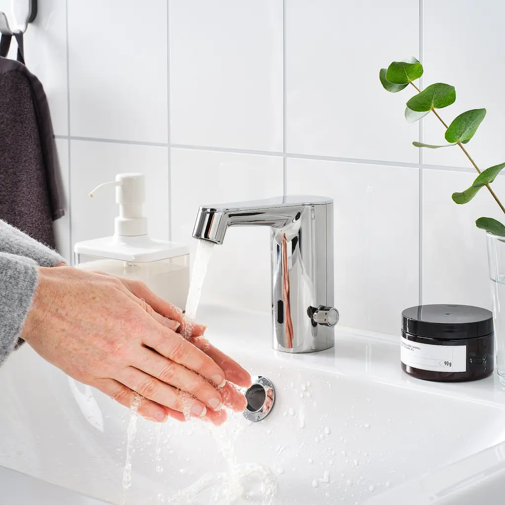 BROGRUND Sink faucet with sensor - chrome plated. 10-year Limited Warranty. Read about the terms in the Limited Warranty brochure. Built-in pressure compensating aerator keeps the water flow just right and enables water-efficiency. 4 batteries (LR6 AA 1.5V) included.