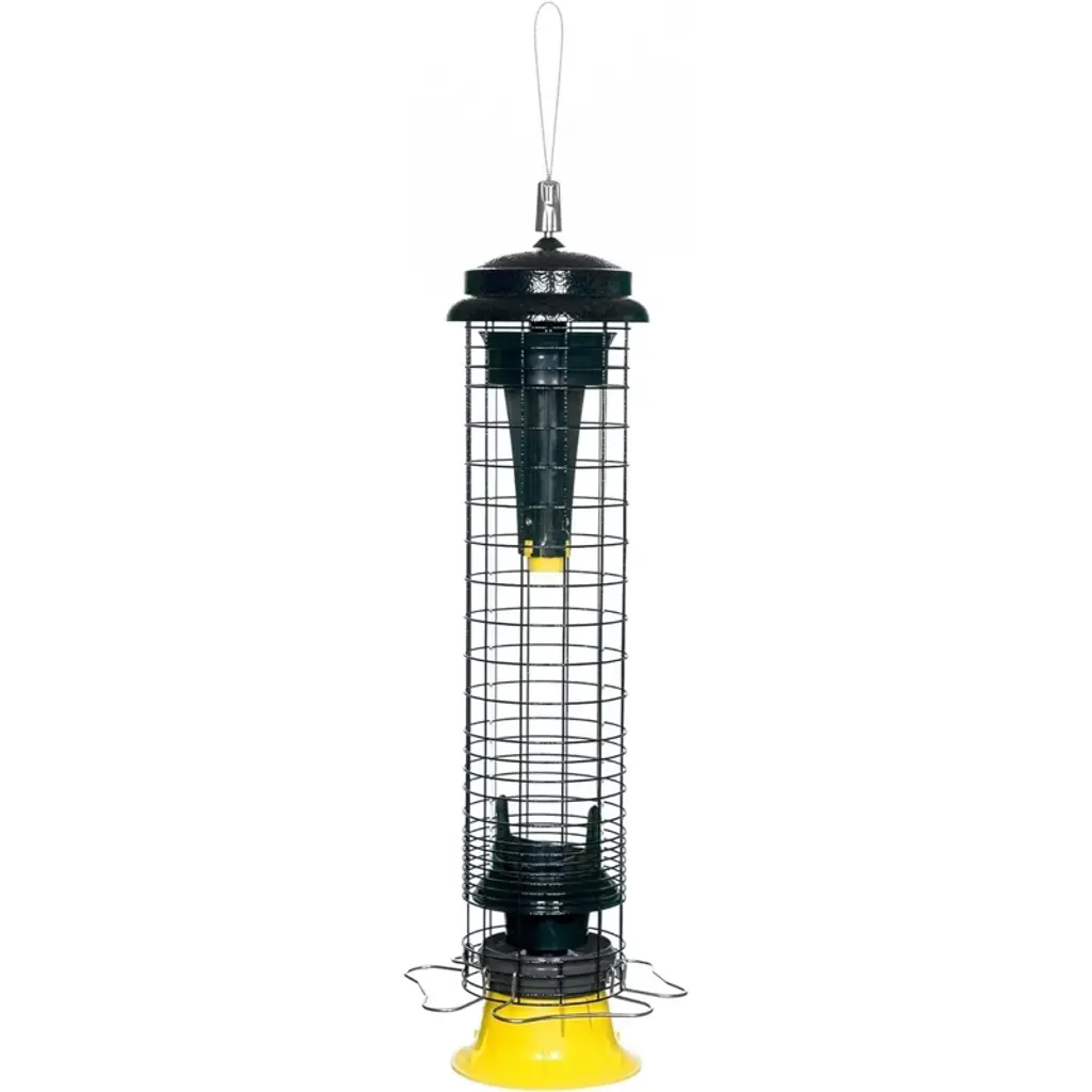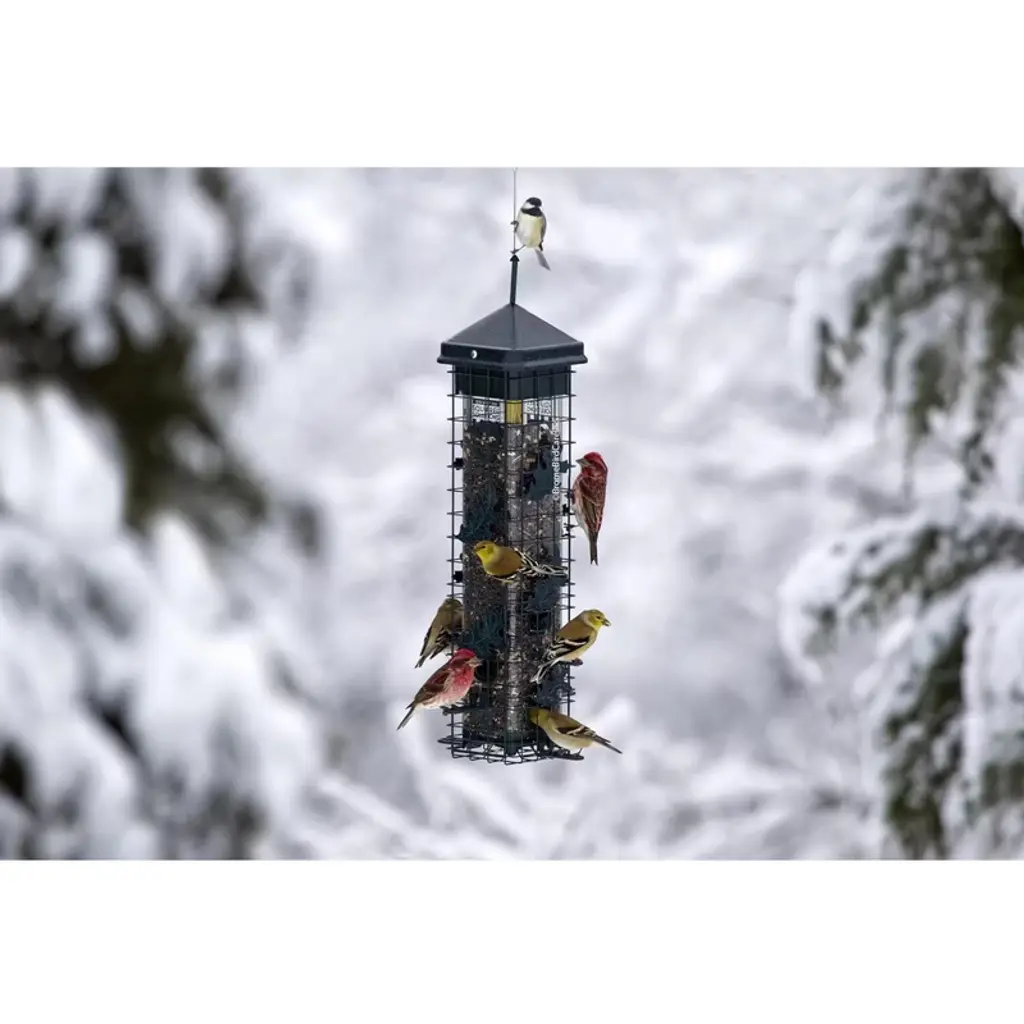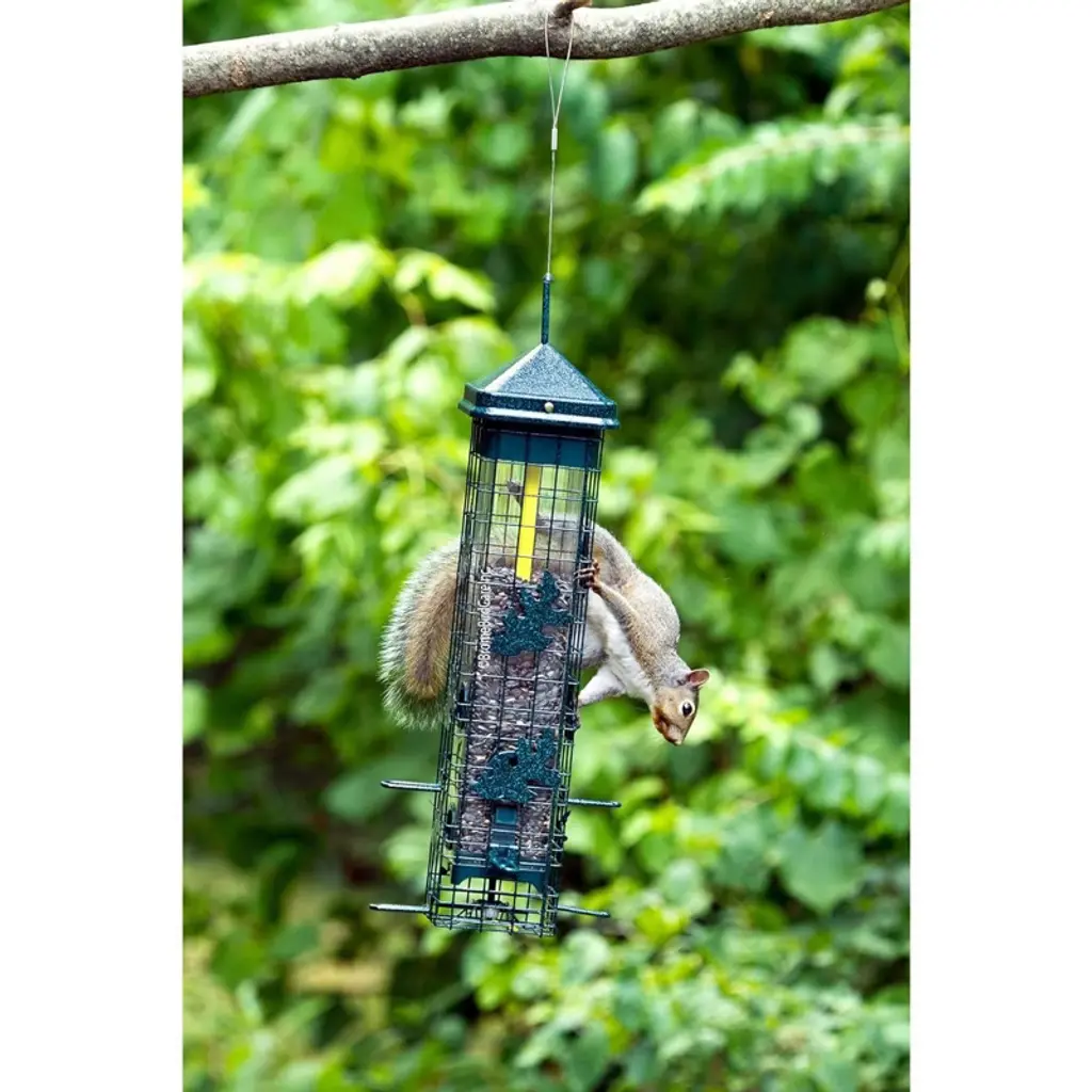 This 100% squirrel-proof wild bird feeder is designed to keep your feathered friends safe while deterring pesky squirrels. It features a beautiful outer steel cage adorned with an elegant leaf emblem, which protects the lightweight inner plastic tube feeder. When squirrels attempt to climb, the cage drops down over all six feeding ports simultaneously, locking them out and allowing birds to feed in peace. The feeder comes with a free funnel for easy refills. Constructed with chew-proof, UV-stabilized components and a powder-coated steel outer cage, this feeder holds up to two quarts of seed, ensuring your birds are well-fed and protected.