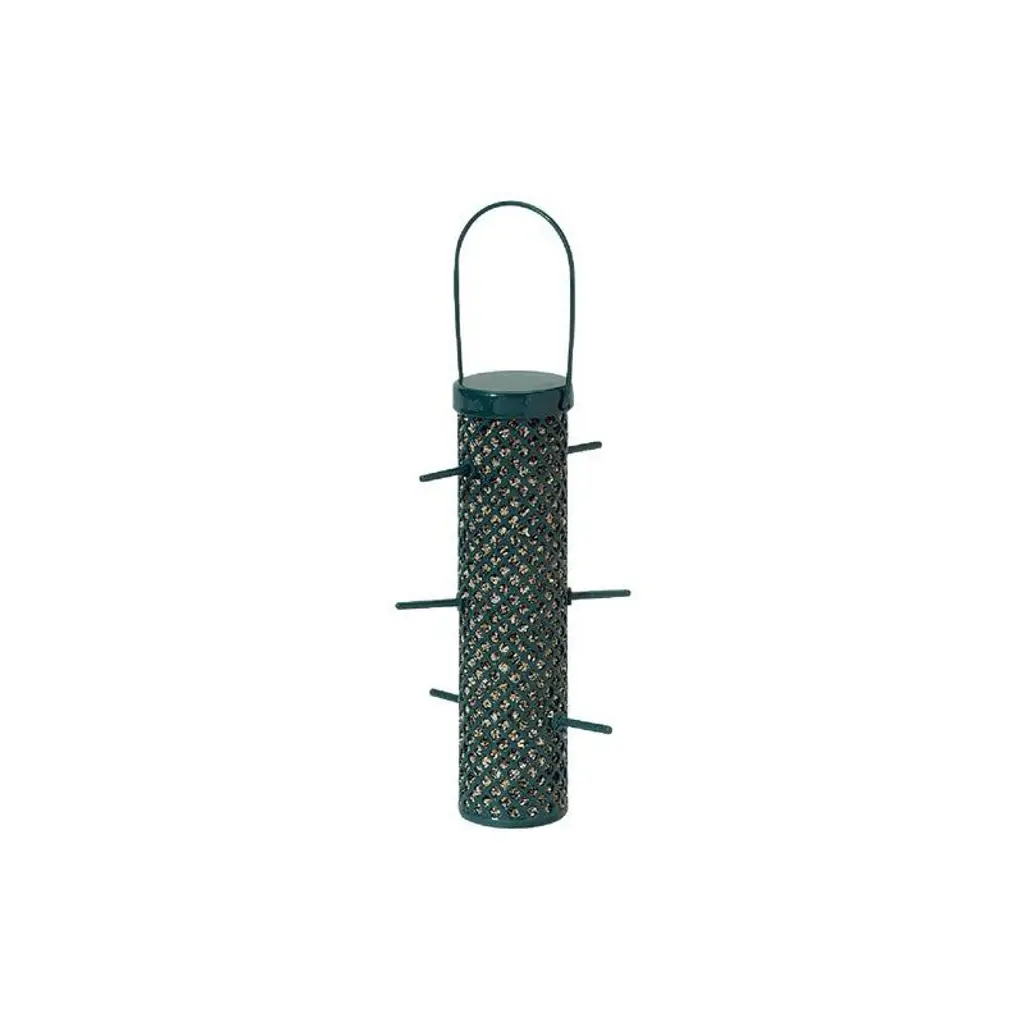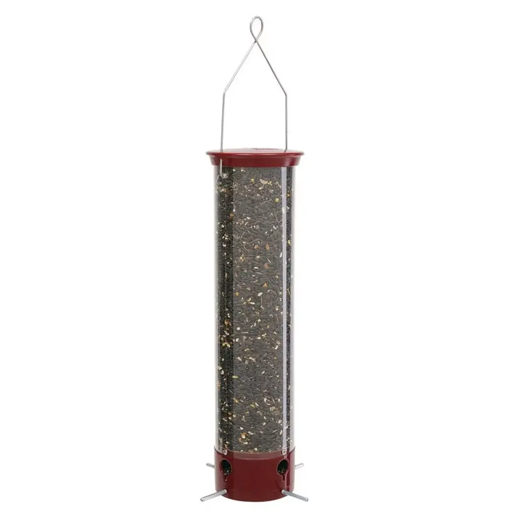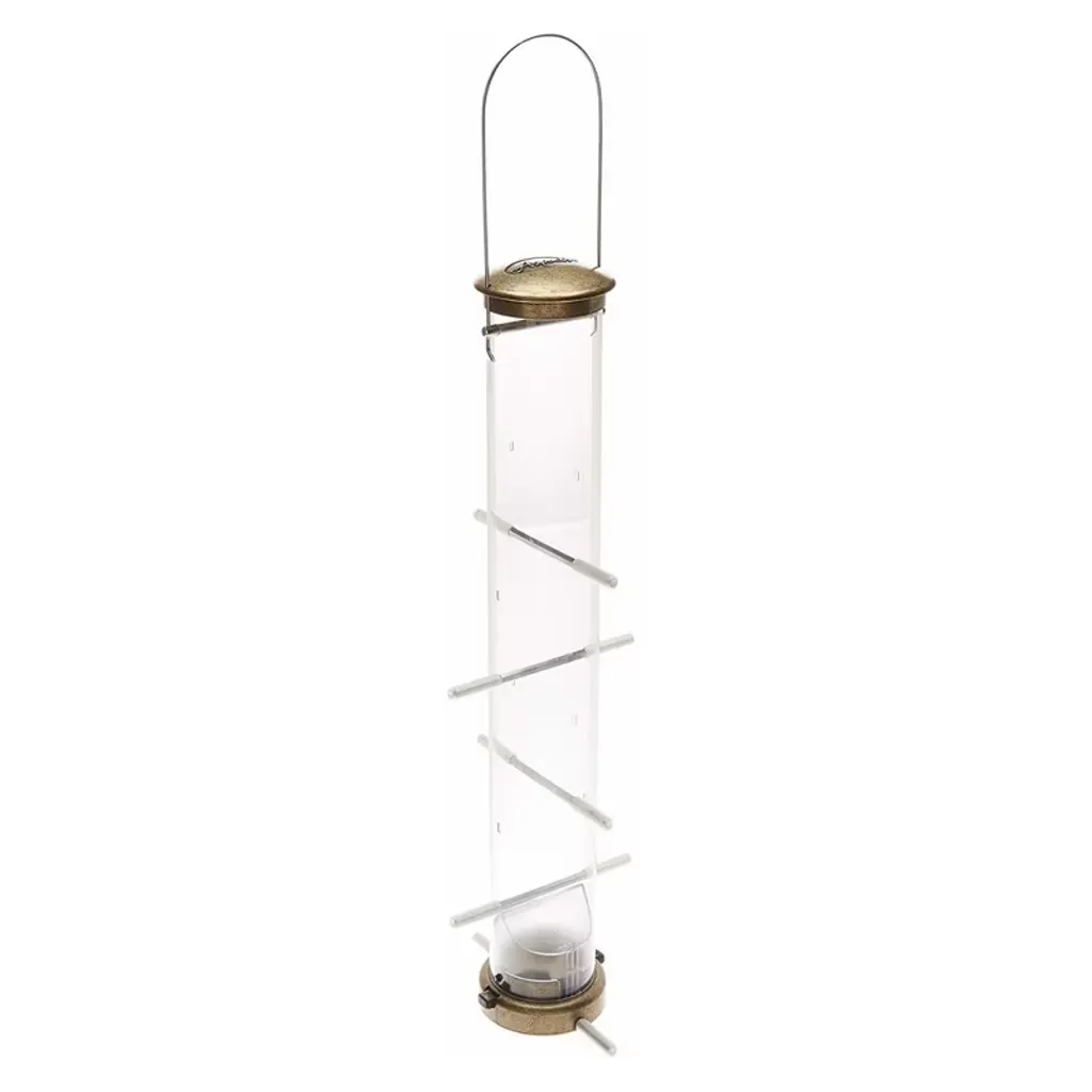 This 100% squirrel-proof wild bird feeder is designed to keep your feathered friends safe while deterring pesky squirrels. It features a beautiful outer steel cage adorned with an elegant leaf emblem, which protects the lightweight inner plastic tube feeder. When squirrels attempt to climb, the cage drops down over all six feeding ports simultaneously, locking them out and allowing birds to feed in peace. The feeder comes with a free funnel for easy refills. Constructed with chew-proof, UV-stabilized components and a powder-coated steel outer cage, this feeder holds up to two quarts of seed, ensuring your birds are well-fed and protected.