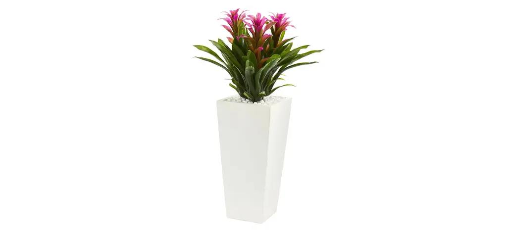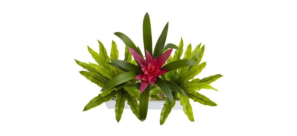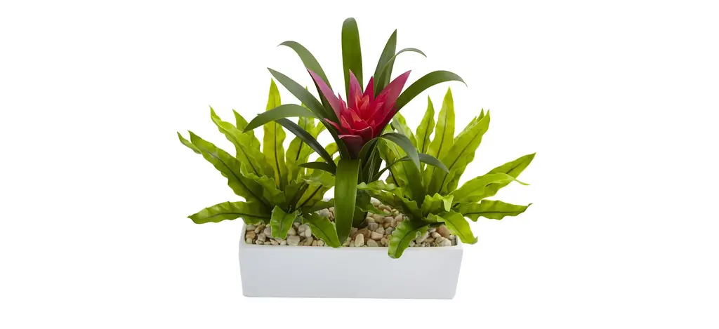 Fiery pink and bright shades of green pop against the crisp white planter of this Bromeliad and Birds nest in Rectangular Planter. Adjustable, textured leaves give the arrangement a lifelike appearance for year-round greenery.