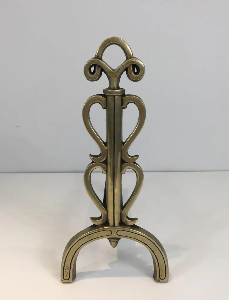This pair of andirons is made of bronze and iron. They are French, from the 1930s, in the style of Raymond Subes or Jules Leleu. They are typical from the Art Deco period. They are signed.
