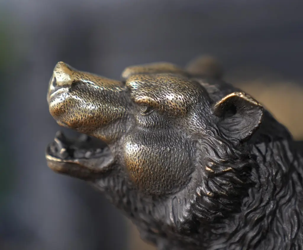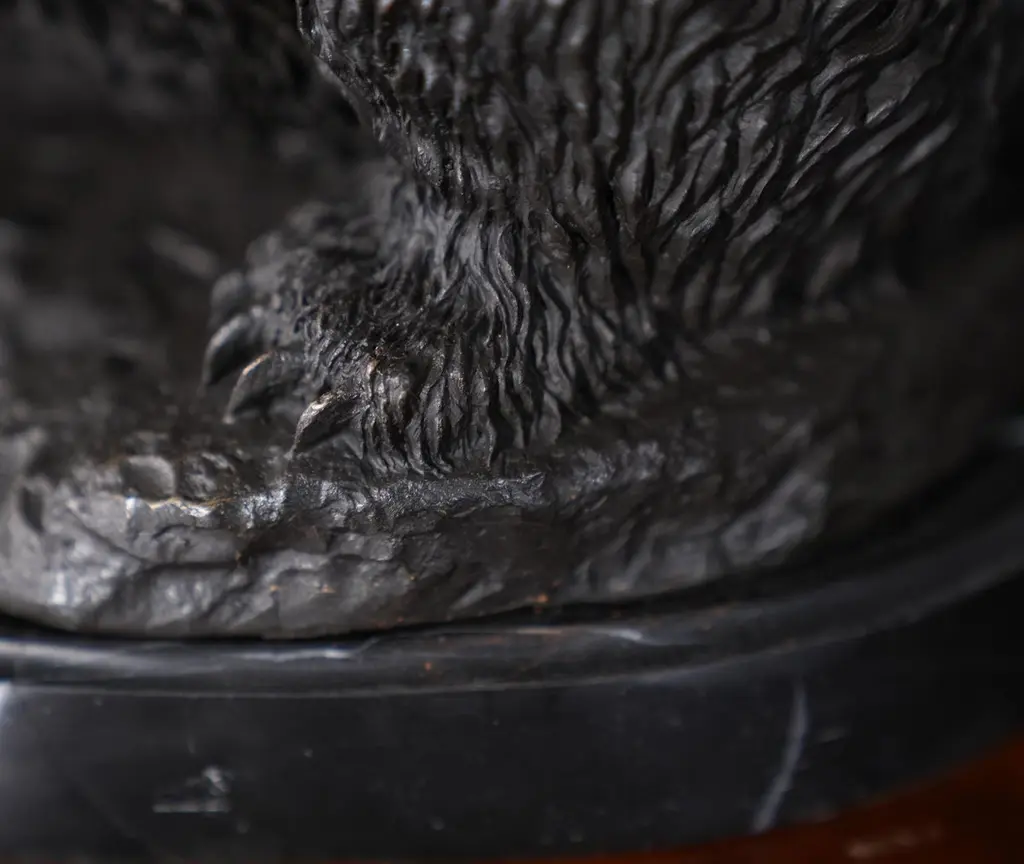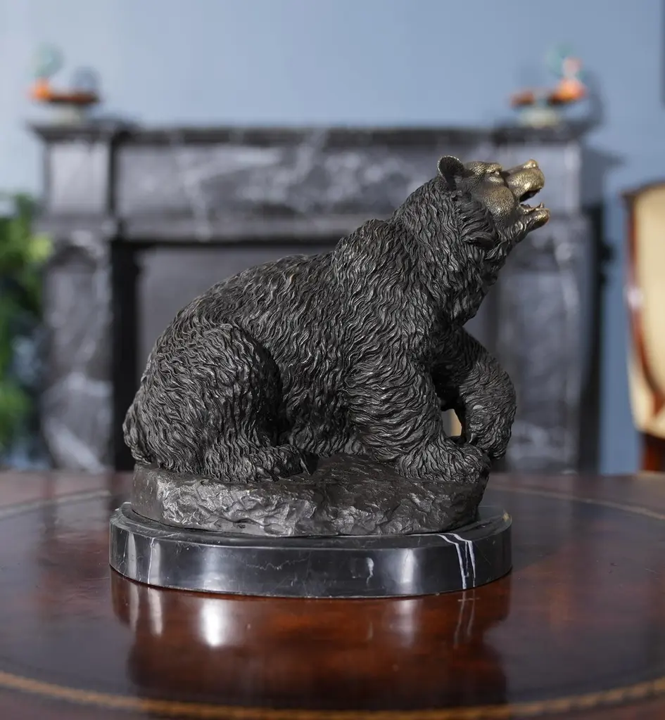 Fearsome even when standing still the Bronze Bear on Marble Base is a striking addition to any setting. Using traditional lost wax casting methods the Bronze Bear statue is created in pieces and then joined together with brazing and hand chaised details are added to give a high level of detail to the figure. The Bronze Bear is then mounted on a solid marble base to lend it stability as well as an enduring appearance. The Bronze Bear on Marble Base is finished in a multi stage, time consuming process requiring skilled and experienced artisans. The rich and varied shades of finish lend themselves to almost any decor, they appear especially striking when displayed in a well lit area.Item Measures Approximately 12 W x 8 D x 10 H