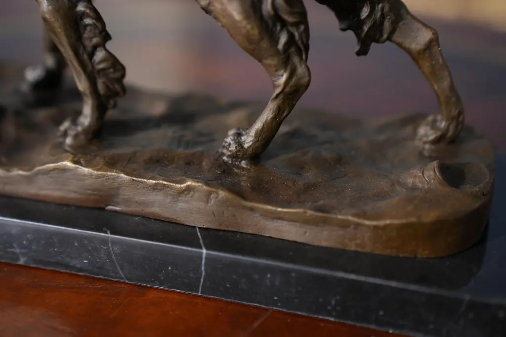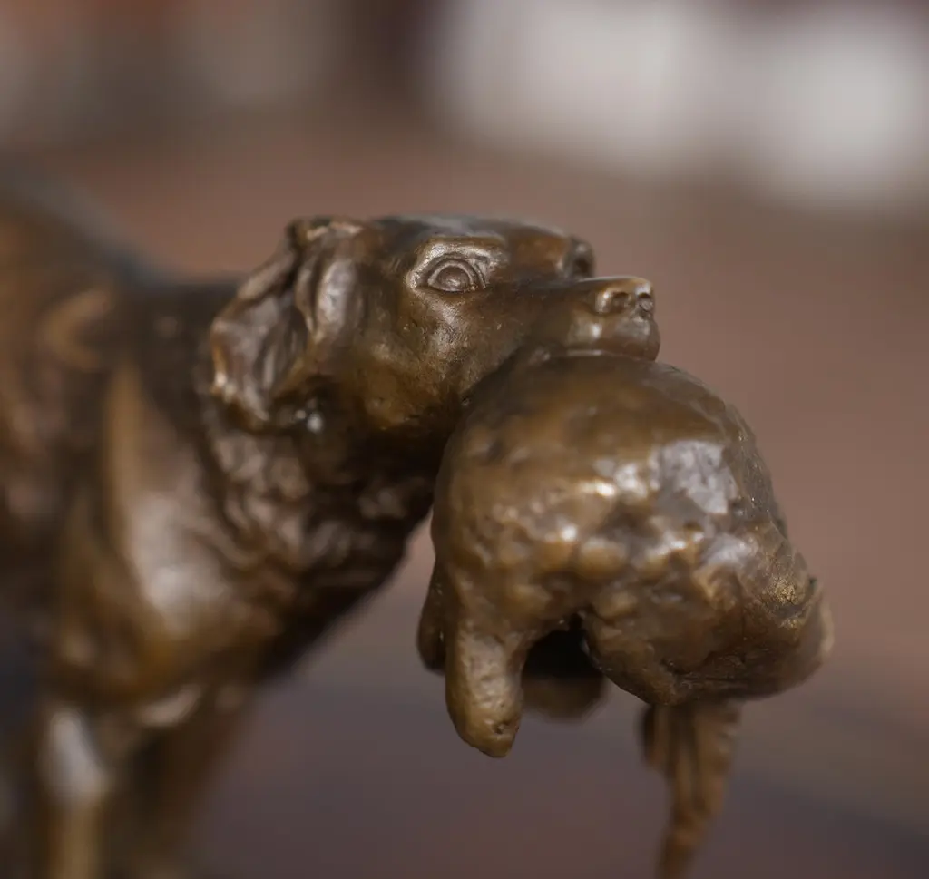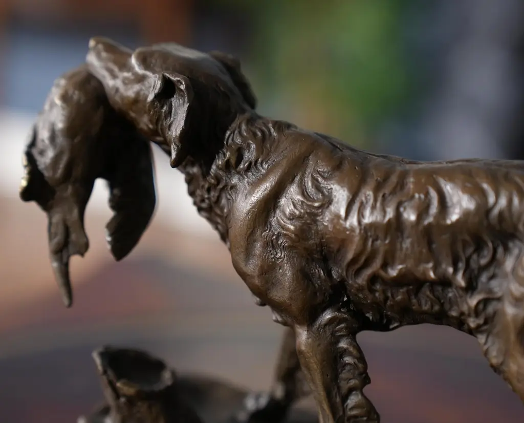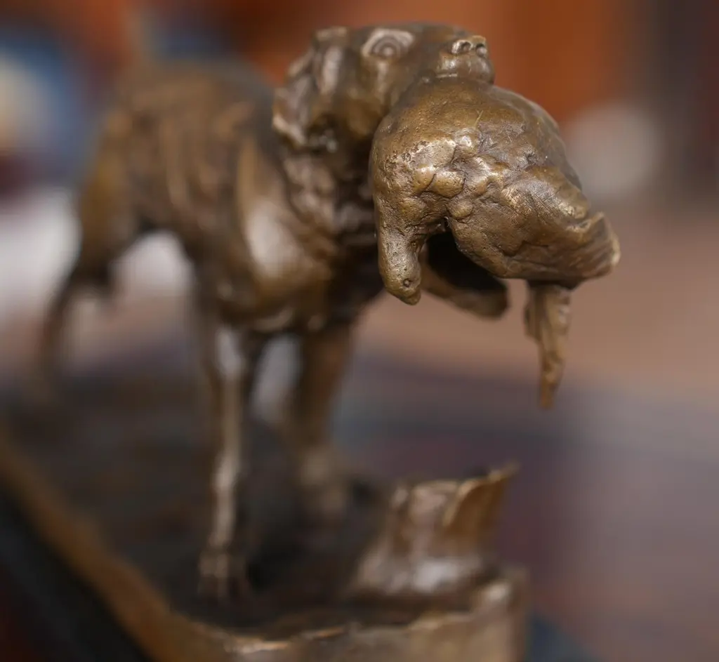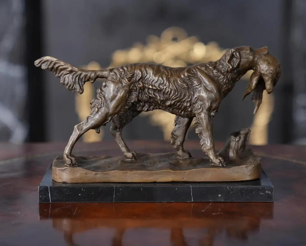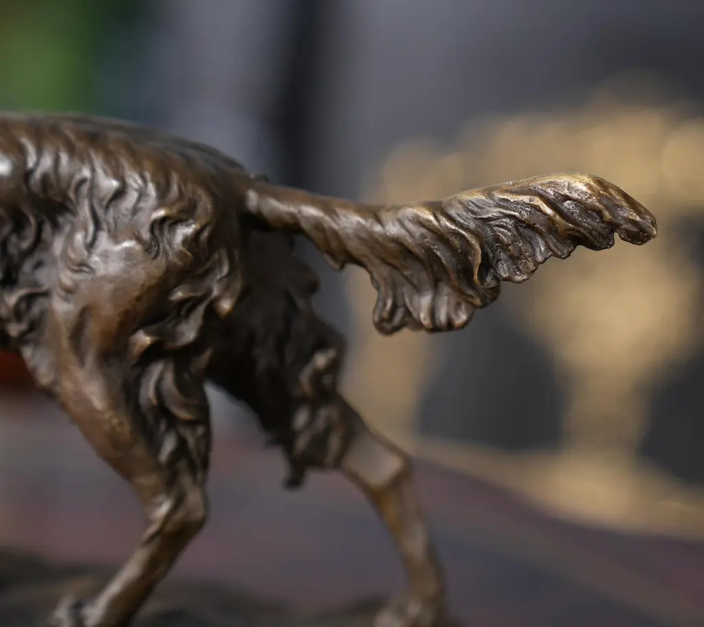 Graceful even when standing still the Bronze Bird Dog on Marble Base is a striking addition to any setting. Using traditional lost wax casting methods the Bronze Bird Dog statue is created in pieces and then joined together with brazing and hand chaised details are added to give a high level of detail to the figure. The Bronze Bird Dog is then mounted on a solid marble base to lend it stability as well as an enduring appearance. The Bronze Bird Dog on Marble Base is finished in a multi stage, time consuming process requiring skilled and experienced artisans. The rich and varied shades of finish lend themselves to almost any decor, they appear especially striking when displayed in a well lit area.Item Measures Approximately 11 W x 5 D x 7 H