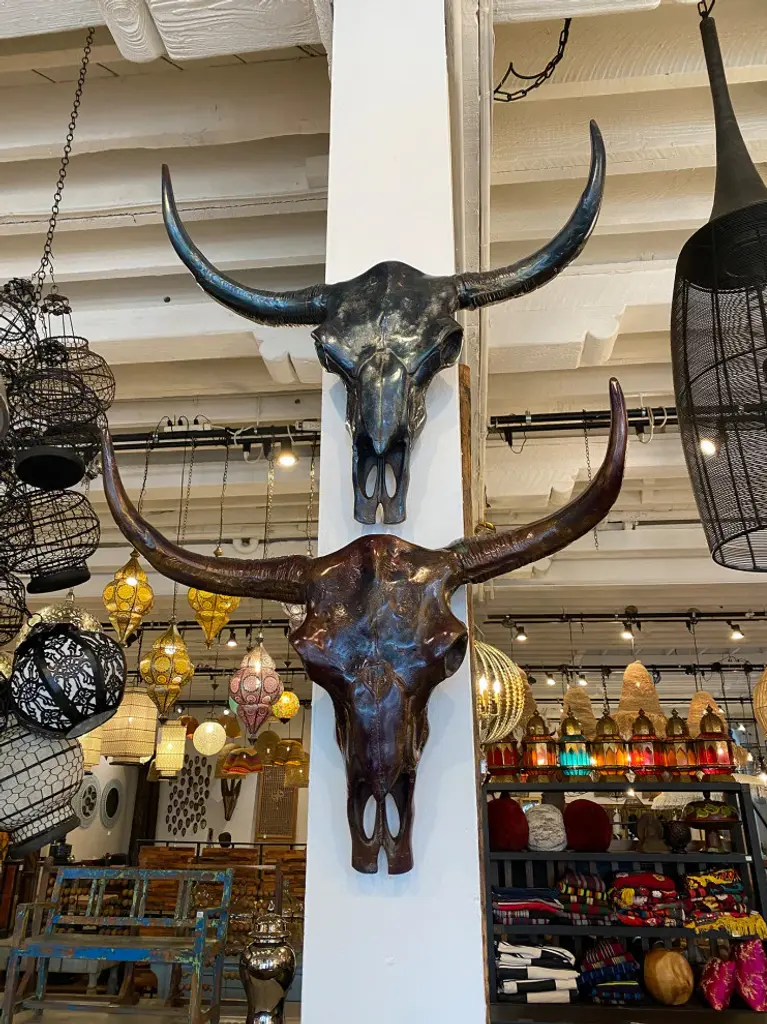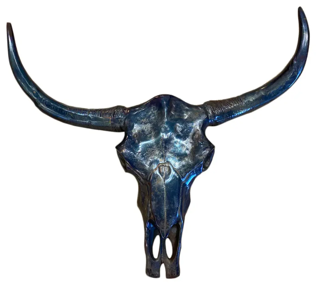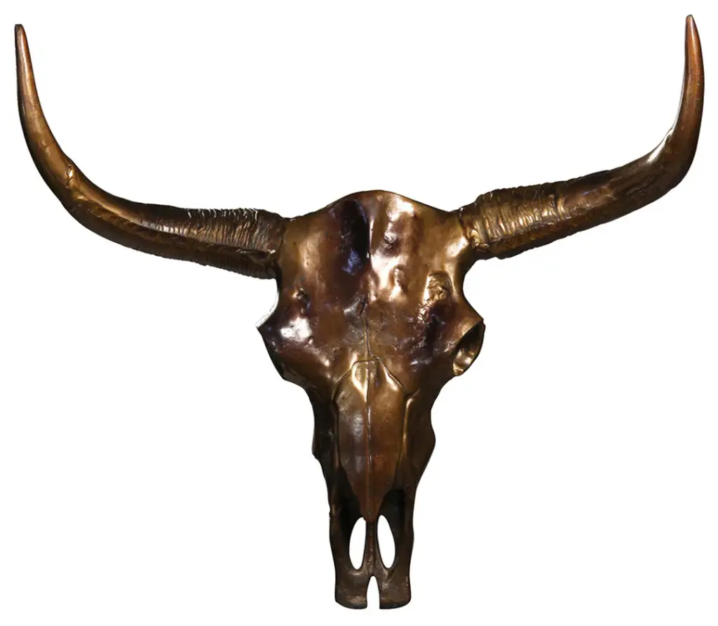 Dark bronze finish aluminum cow skull sculptural wall art from India. Great alternative unique wall art and focal piece to any room. Each varies in exact finish tones/textures. This item is non-returnable - all sales are final.
