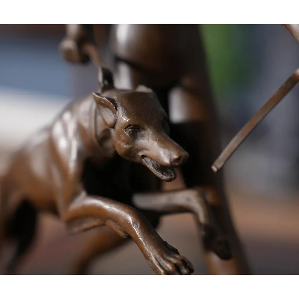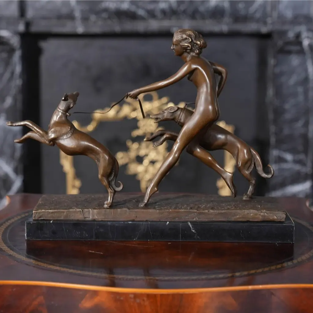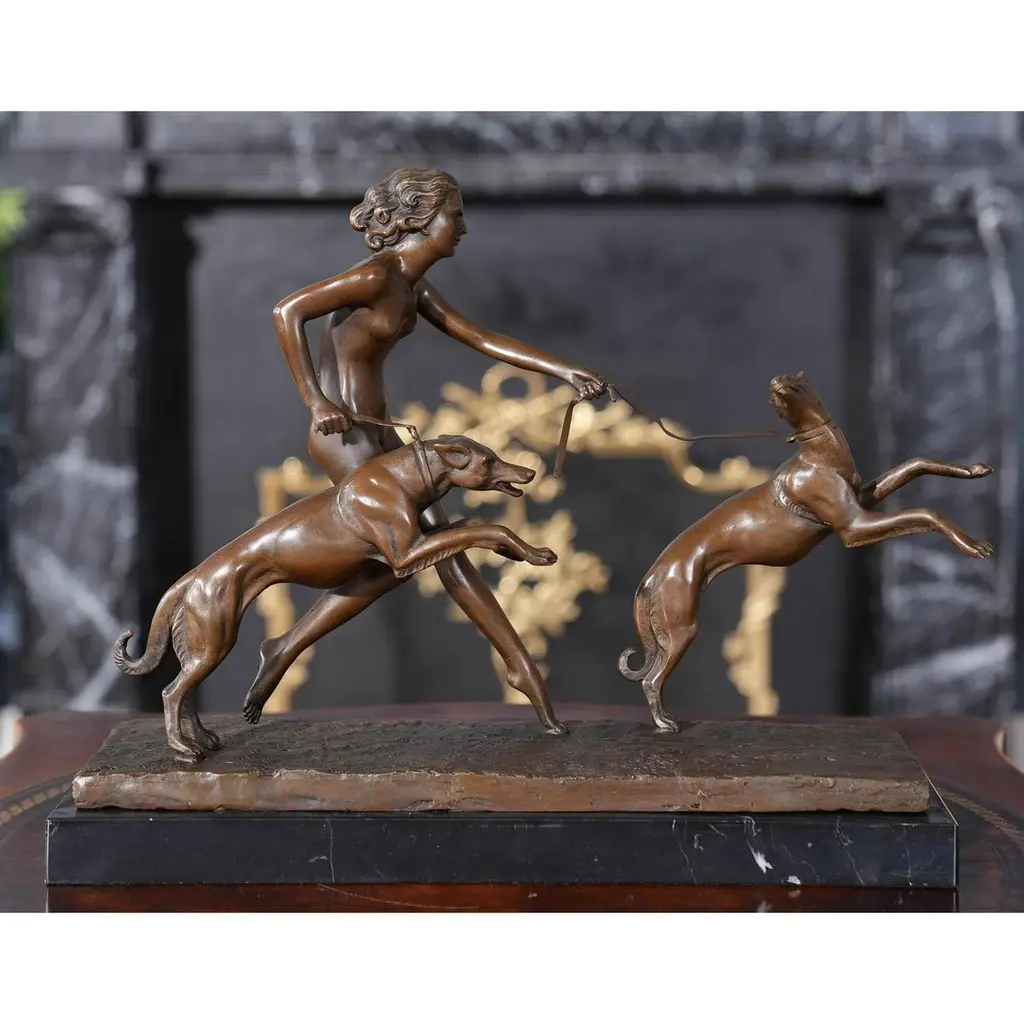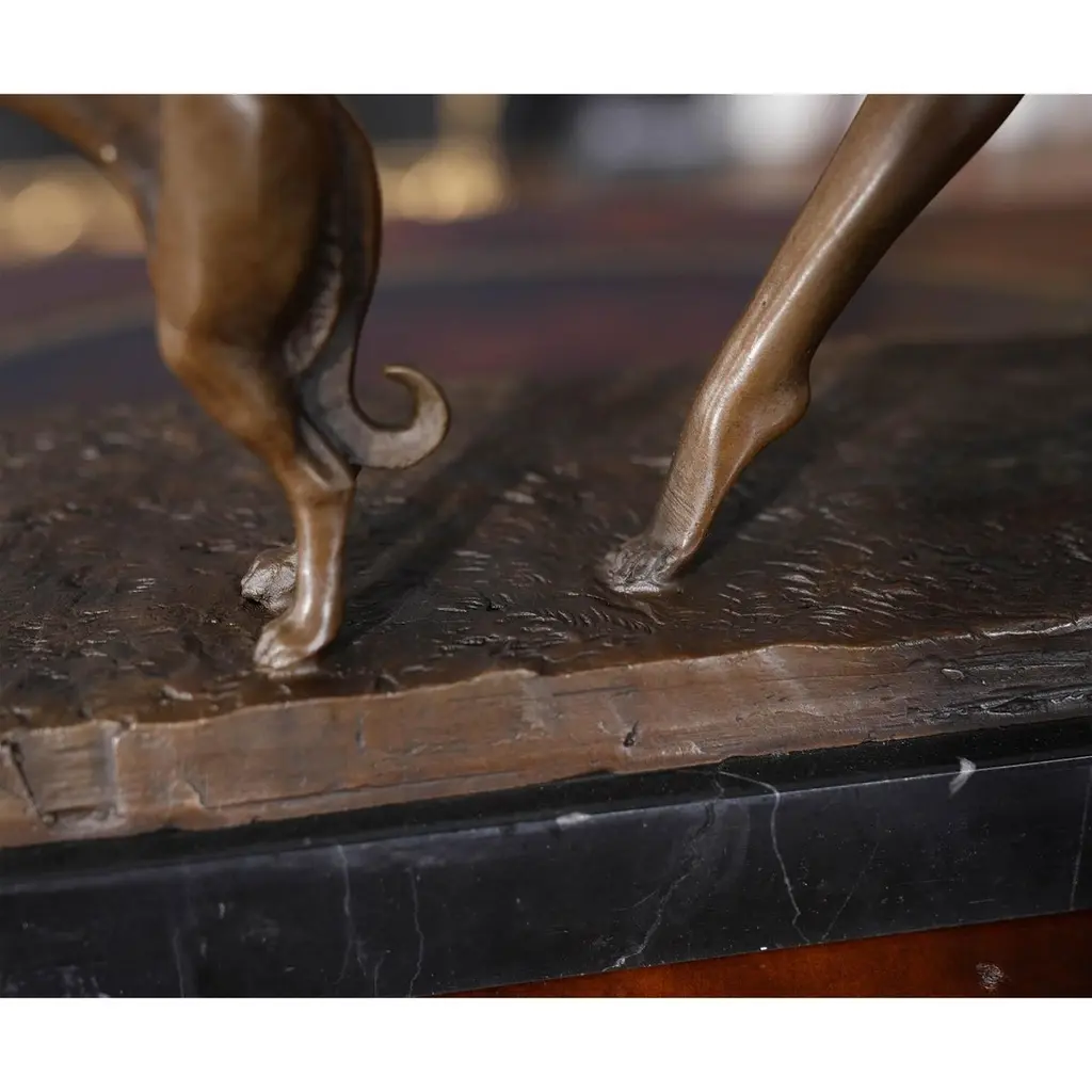 Graceful even when motionless the Bronze Girl with Dogs on Marble Base is a striking addition to any setting. Using traditional lost wax casting methods the Bronze Girl with with Dogs statue has hand chaised details added to give a high level of detail to the figure. The Girl with Dogs is then mounted on a solid marble base to lend it stability as well as an enduring appearance. The Bronze Girl with Dogs on Marble Base is finished in a multi stage, time consuming process requiring skilled and experienced artisans. The rich and varied shades of finish lend themselves to almost any decor, they appear especially striking when displayed in a well lit area.Item Measures Approximately 18 W x 6 D x 13 H