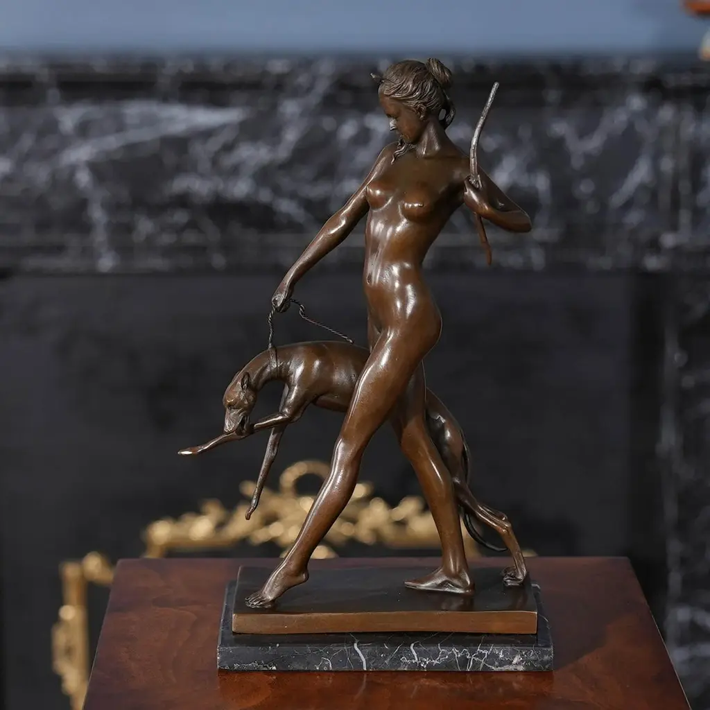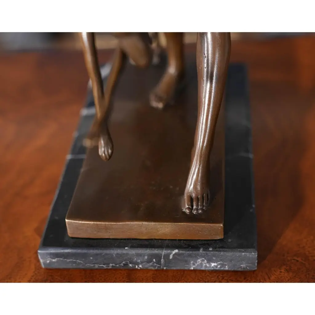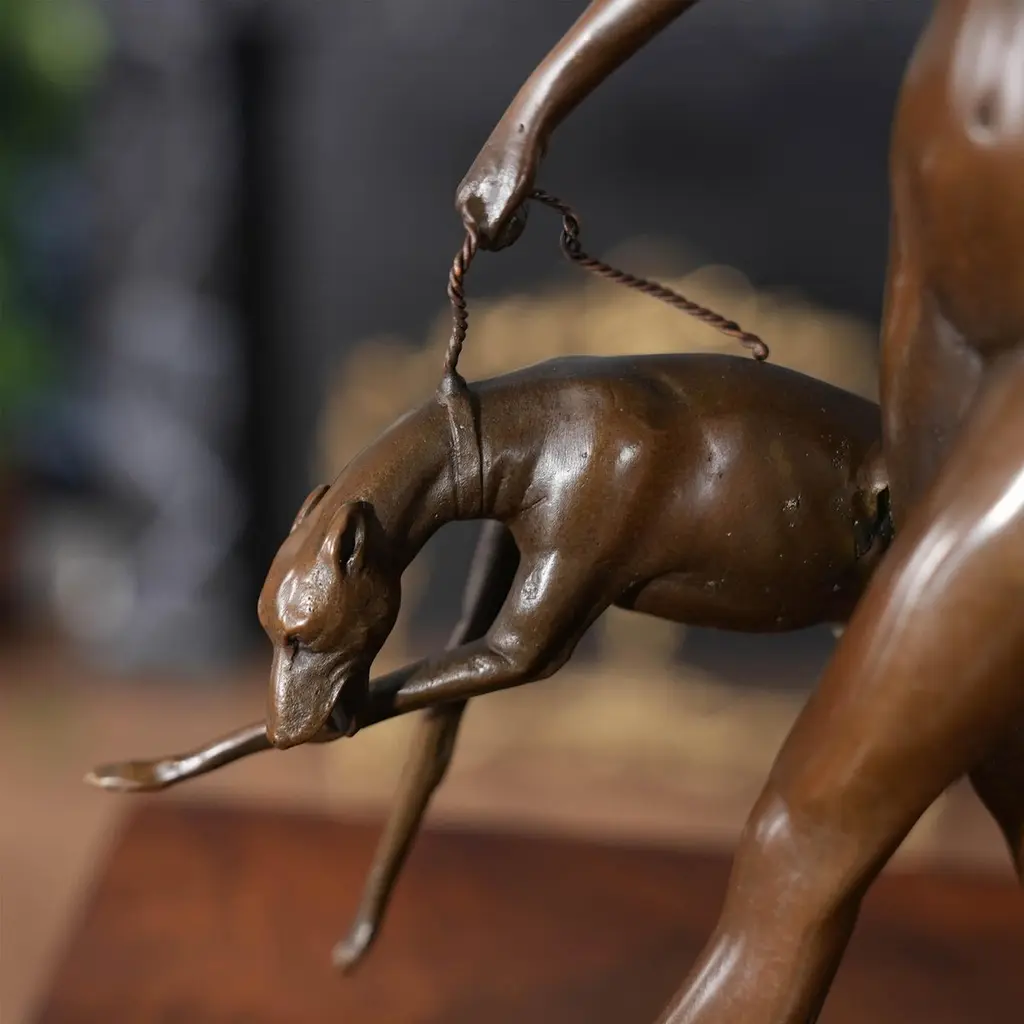 Graceful even when motionless the Bronze Huntress with Dog on Marble Base is a delightful addition to any setting. Using traditional lost wax casting methods the Bronze Huntress with Dog statue has hand chaised details added to give a high level of detail to the figure. The Bronze Huntress with Dog is mounted on a solid marble base to lend it stability as well as an enduring appearance. The Bronze Huntress with Dog on Marble Base is finished with a multi stage, time consuming process requiring skilled and experienced artisans. The rich and varied shades of finish lend themselves to almost any decor, they appear especially striking when displayed in a well lit area.Item Measures Approximately 7 W x 4.5 D x 13 H