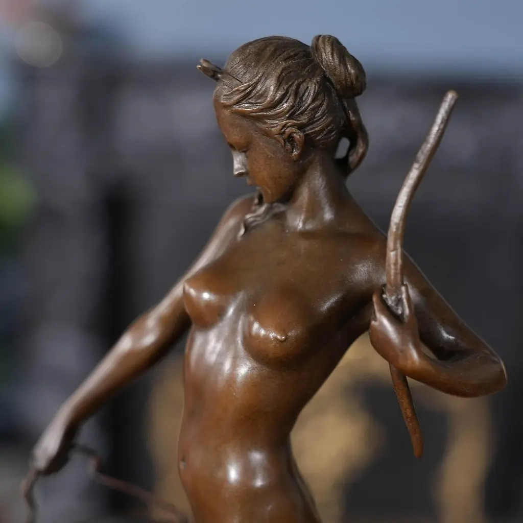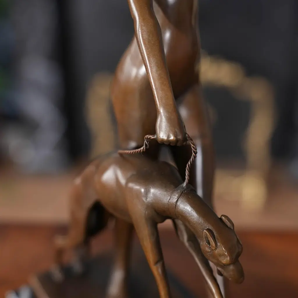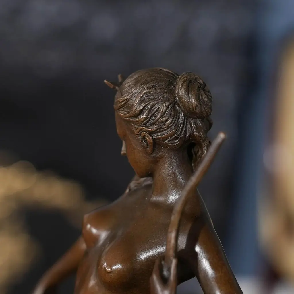 Graceful even when motionless the Bronze Huntress with Dog on Marble Base is a delightful addition to any setting. Using traditional lost wax casting methods the Bronze Huntress with Dog statue has hand chaised details added to give a high level of detail to the figure. The Bronze Huntress with Dog is mounted on a solid marble base to lend it stability as well as an enduring appearance. The Bronze Huntress with Dog on Marble Base is finished with a multi stage, time consuming process requiring skilled and experienced artisans. The rich and varied shades of finish lend themselves to almost any decor, they appear especially striking when displayed in a well lit area.Item Measures Approximately 7 W x 4.5 D x 13 H