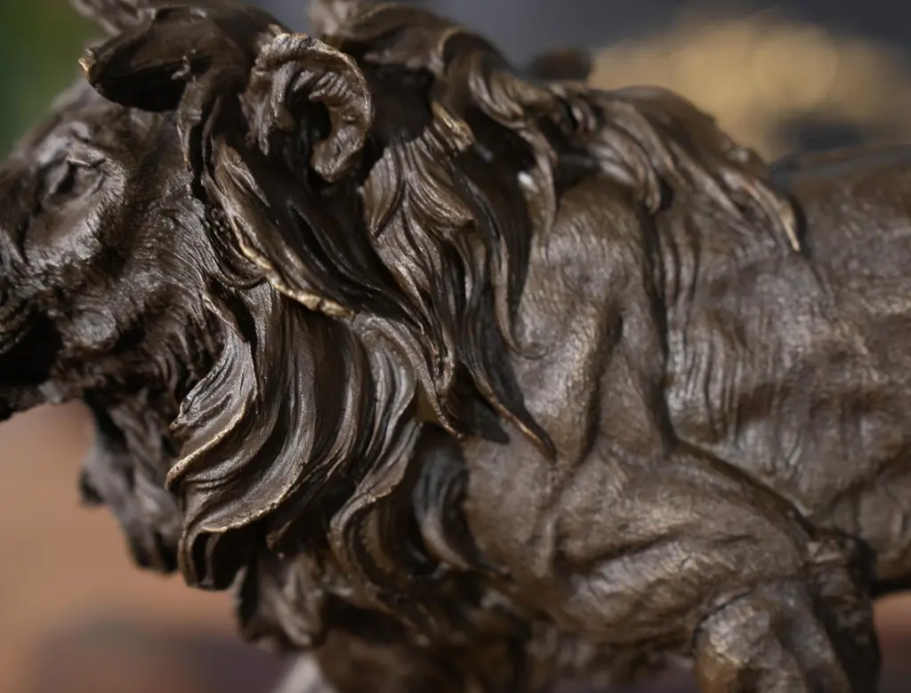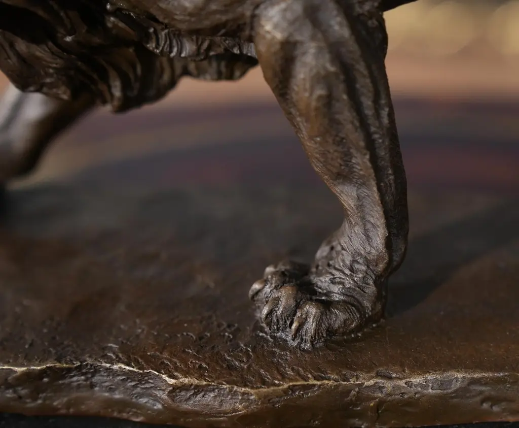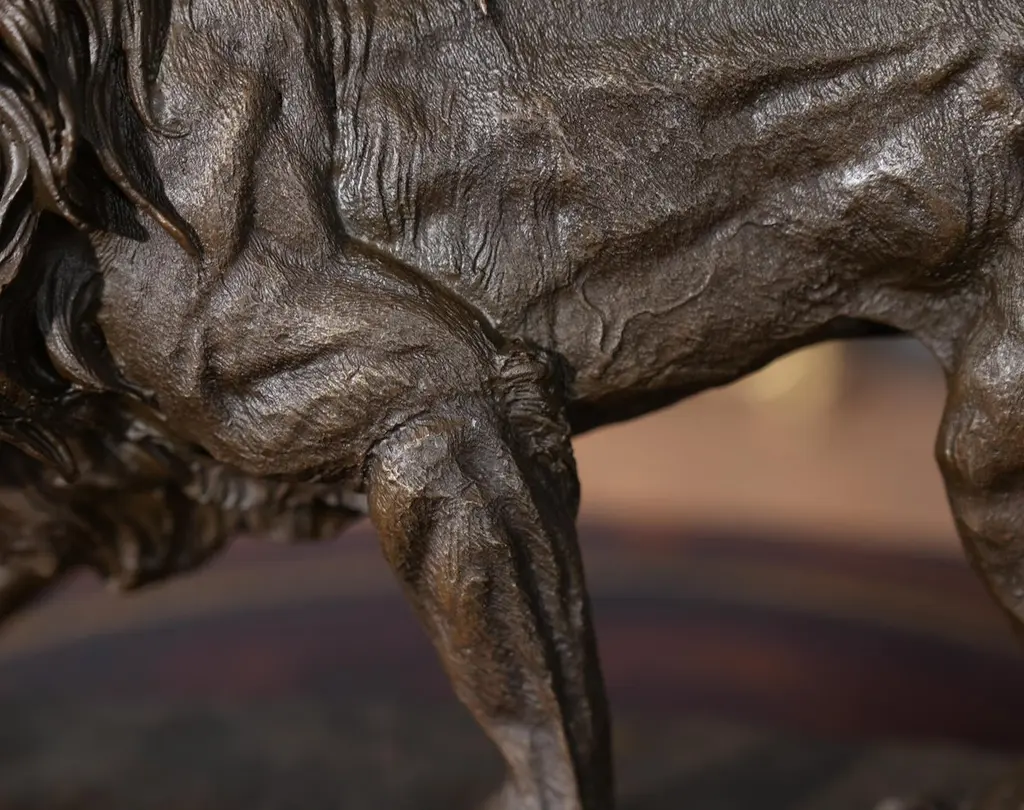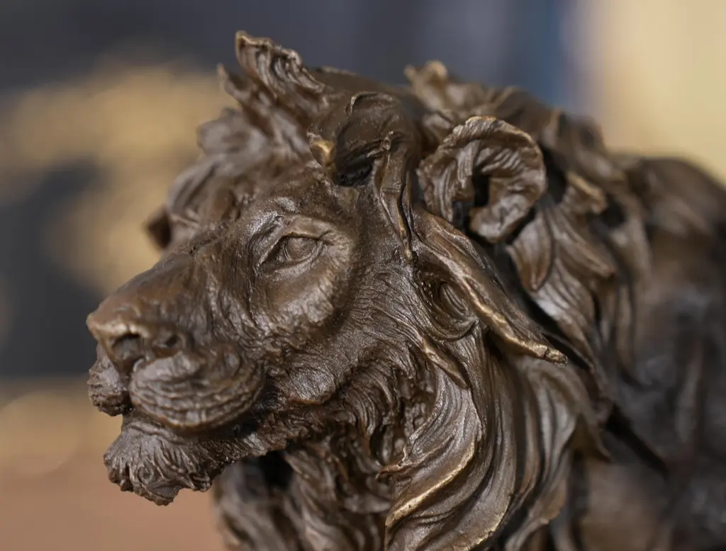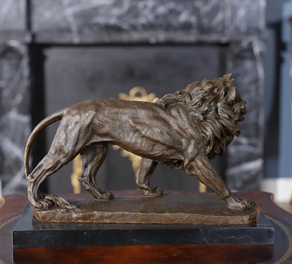 Graceful even when standing still the Bronze Lion with Marble Base is a striking addition to any setting. Using traditional lost wax casting methods the Bull Lion statue is created in pieces and then joined together with brazing and hand chaised details are added to give a high level of detail to the figure. The Lion is then mounted on a solid marble base to lend it stability as well as an enduring appearance. The Bronze Lion with Marble Base is finished in a multi stage, time consuming process requiring skilled and experienced artisans. The rich and varied shades of finish lend themselves to almost any decor, they appear especially striking when displayed in a well lit area.Item Measures Approximately 17 W x 7 D x 11 H