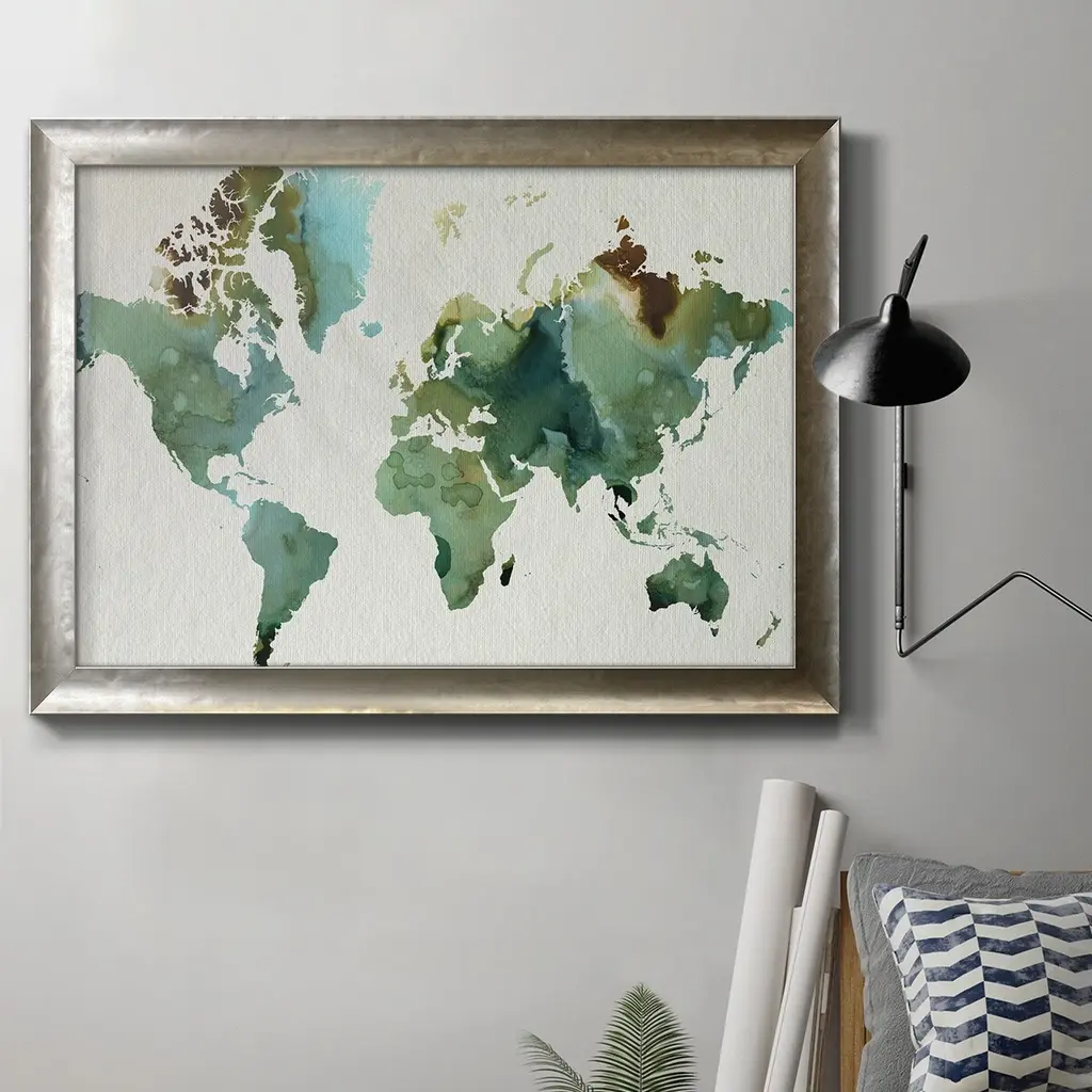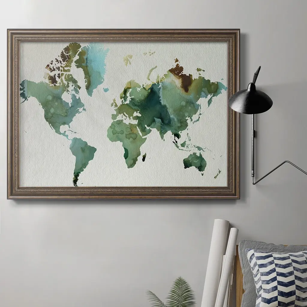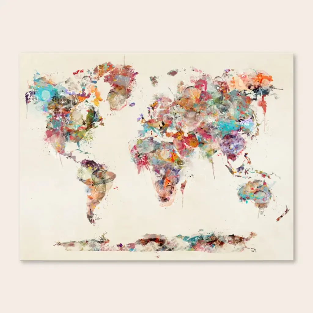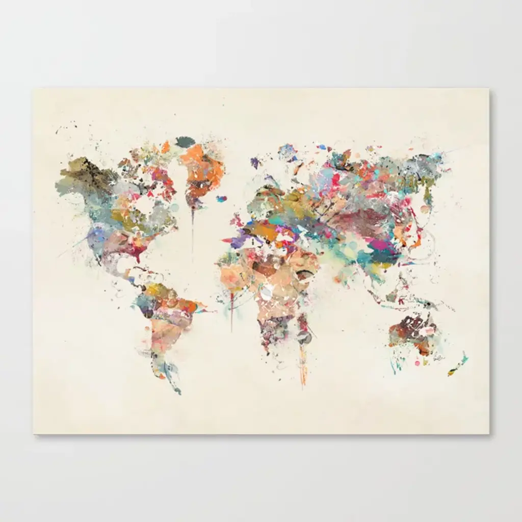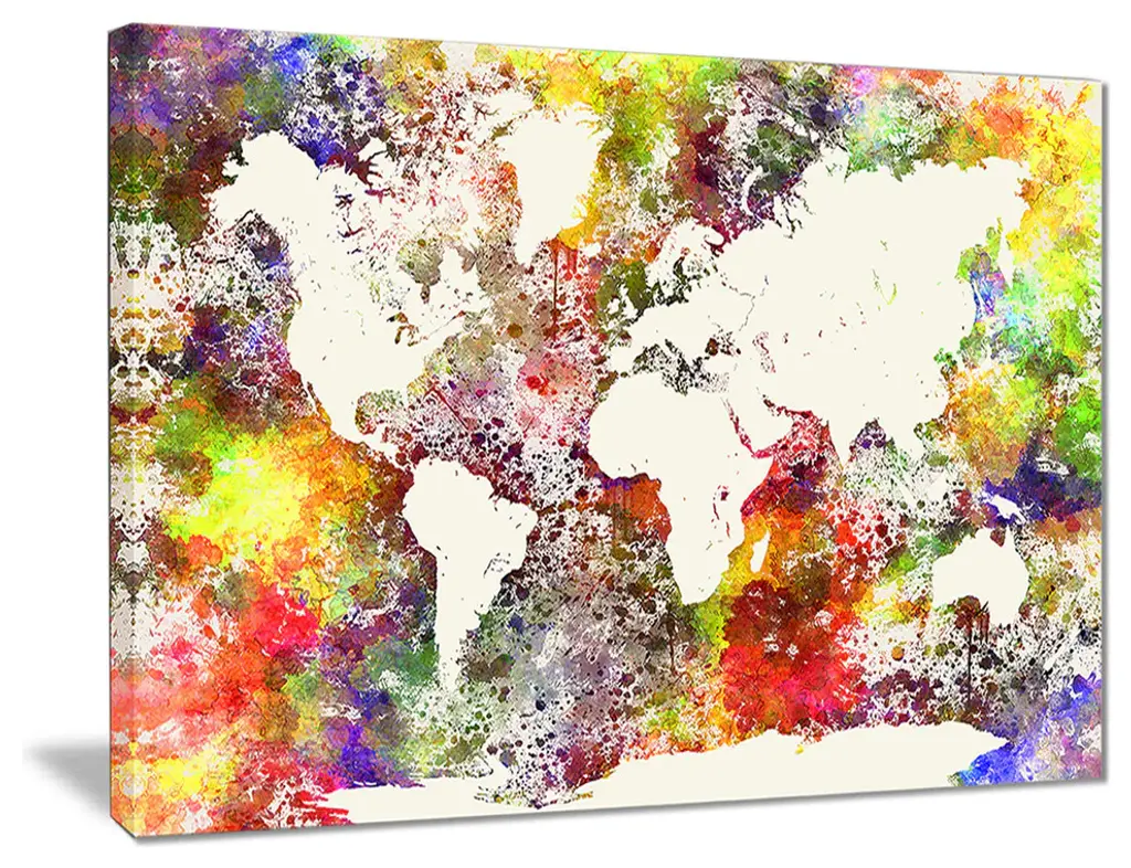 Title: Bronze Paint Splash World MapArtist: Michael TompsettProduct Type: Canvas ArtSize: 30" x 47"Made in the USA.Art and design were always Michael's favorite subjects at school. He was fortunate to land a job as a graphic designer at one of London's most prestigious publishing companies. After 12 years Michael Tompsett made the decision to pursue a full-time career creating his own work. The freedom and time to be able to focus solely on his own projects has been a wonderful experience. Although Michael likes to experiment with different styles and subjects, his main focus is on map art. He enjoys looking for unique and interesting ways to depict something familiar. Maps are visual representations of the world we live in, a world which is incredibly diverse. Apart from maps, Tompsett creates urban landmark and cityscape designs.This 30" x 47" canvas art is ready to hang. Giclee (jee-clay) is an advanced printmaking process for creating high quality fine art reproductions. The attainable excellence that Giclee printmaking affords makes the reproduction virtually indistinguishable from the original piece. The result is wide acceptance of Giclee by galleries, museums, and private collectors. Gallery wrap is a method of stretching an artist's canvas so that the canvas wraps around the sides and is secured to a hidden, wooden frame. This method of stretching and preparing a canvas allows for a frameless presentation of the finished print.