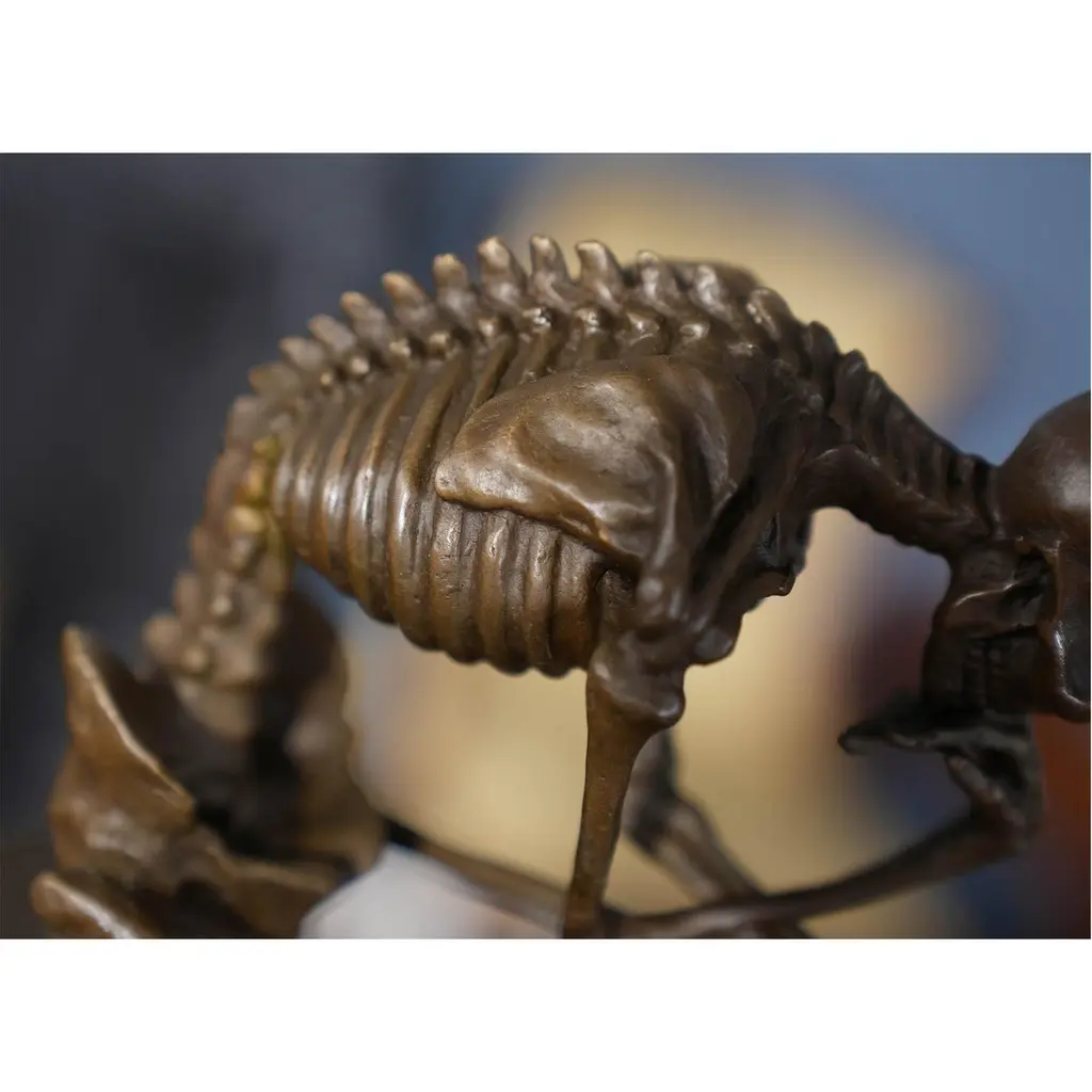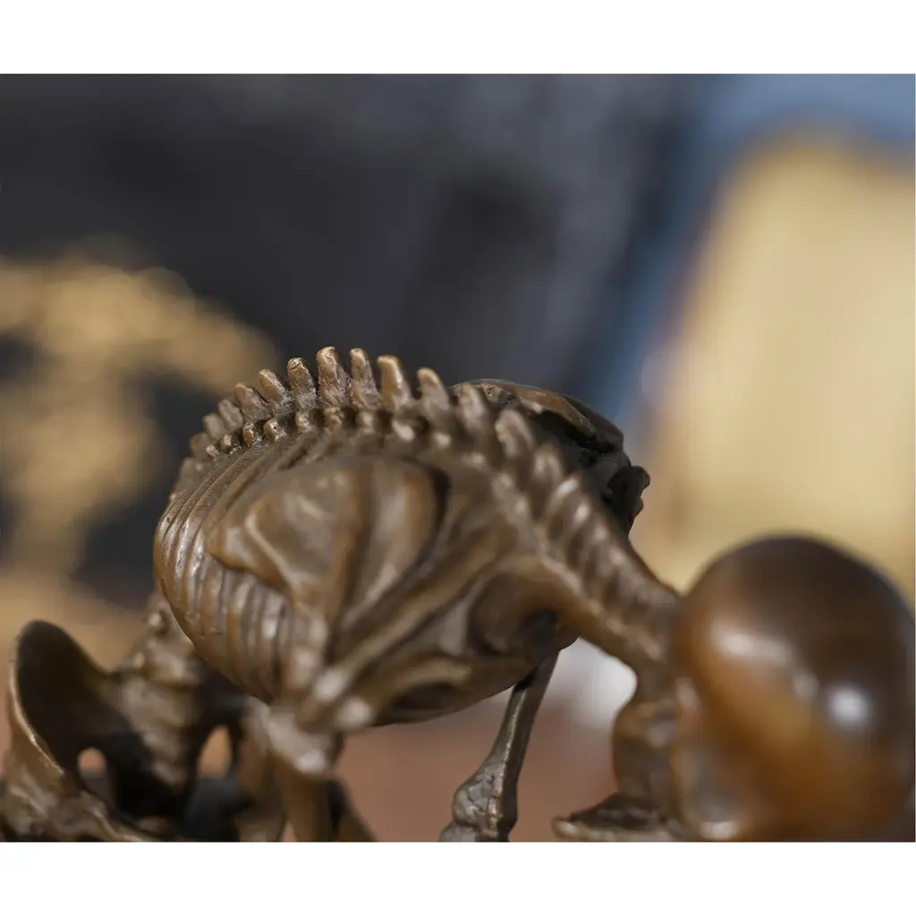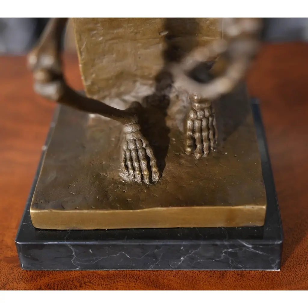Graceful even when standing still the Bronze Skeleton Thinker on Marble Base is a striking addition to any setting. Using traditional lost wax casting methods the Bronze Skeleton Thinker statue has hand chaised details added to give a high level of detail to the figure. The Bronze Skeleton Thinker is then mounted on a solid marble base to lend it stability as well as an enduring appearance. The Bronze Skeleton Thinker on Marble Base is finished in a multi stage, time consuming process requiring skilled and experienced artisans. The rich and varied shades of finish lend themselves to almost any decor, they appear especially striking when displayed in a well lit area.Item Measures Approximately 6 W x 5 D x 10 H