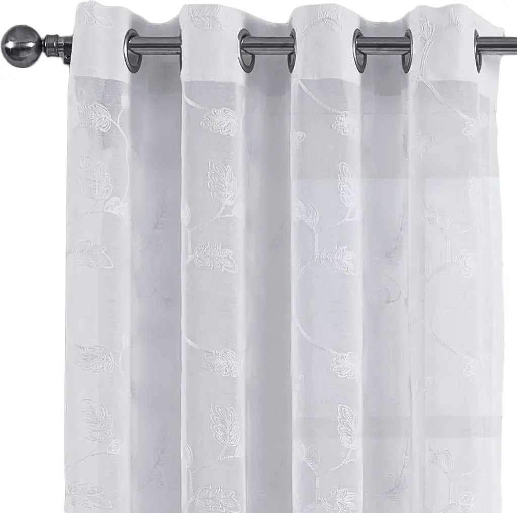 Update the look of any window or any room with our Brook Embroidered Grommet top sheer curtain set. This curtain set features full width 2 panels at 54 inches eachand modern all over embroidery with top grommet rings. Available in full range of lengths this window treatment will surely add freshness and update to any room. - Sold in Pairs- 100% Polyester Sheer- Full Panel width 54" inches- Grommet Top Rings to fit up to 1.5" rod Diameter - Allows Light in while keeping privacy - Royal Tradition Collection- Dry CleanAvailable Sizes- 108" Wide x 63" Long Pair (54" X 63" Each).- 108" Wide x 84" Long Pair (54" X 84" Each).- 108" Wide x 96" Long Pair (54" X 96" Each).- 108" Wide x 108" Long Pair (54" X 108" Each).