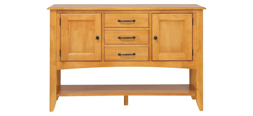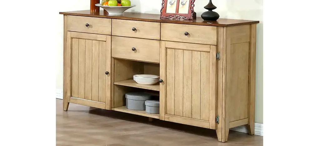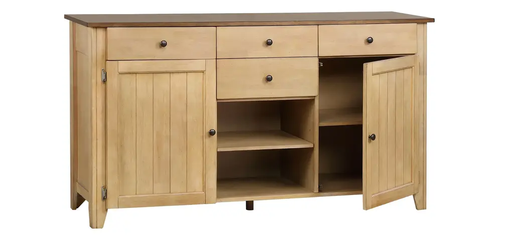 Brook credenza is accented with metal aged bronze knobs & distressed two tone light creamy wheat with warm pecan finish seat. Perfect for any home.