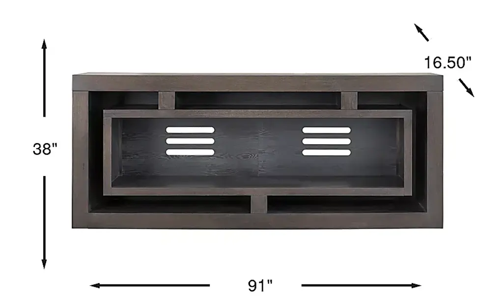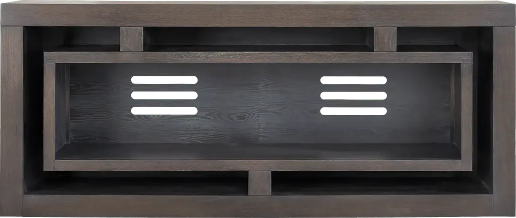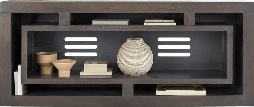Nights of warmth and connection glow with the beautifully balanced symmetry and simple yet thoughtful details of the Brookland Park collection, creating a serene foundation for your home entertainment center. Grounded in natural charisma and transitional style, this console is finished in espresso black. Its clean rectangular frame offers a handsome silhouette, while the geometric open shelving with rear wire management holes provides plenty of space to organize media devices and display decorations.