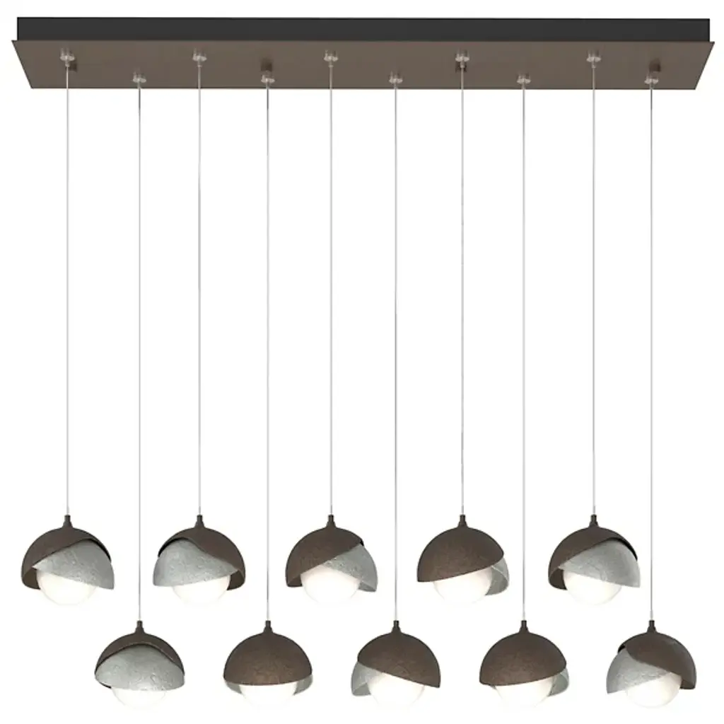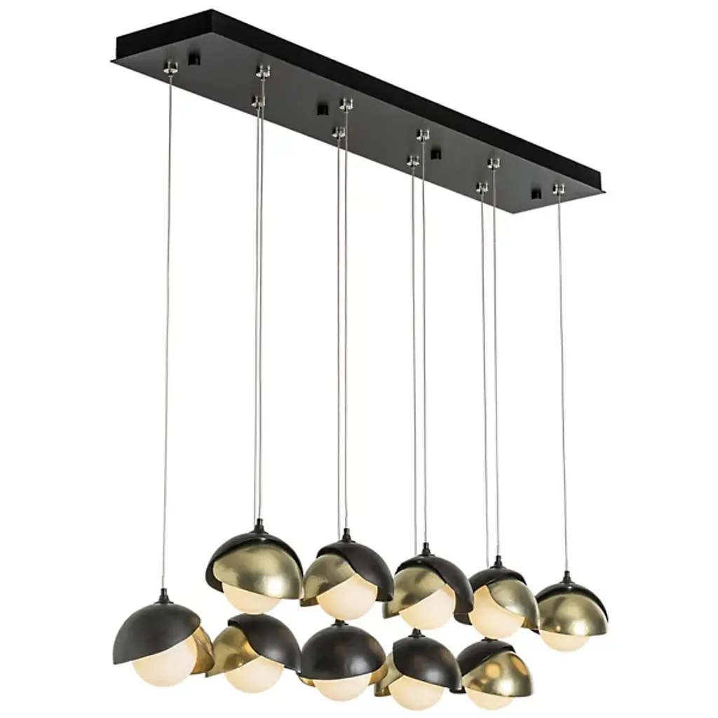An organic lighting look, with a healthy dose of industrial refinement. Each pendant in the Brooklyn 10-Light Double Shade Rectangular Multi-Light Pendant by Hubbardton Forge has a curved, 2-piece metal shade curving around a glass orb, like a hand-forged pod around a delicate seed. You can customize this multi-light pendant to complement your home’s décor by choosing a different finish for both halves of the shades. Hang all 10 pendants at the same level or in an infinite array of staggered heights to achieve just the right look over a long dining table or kitchen island.