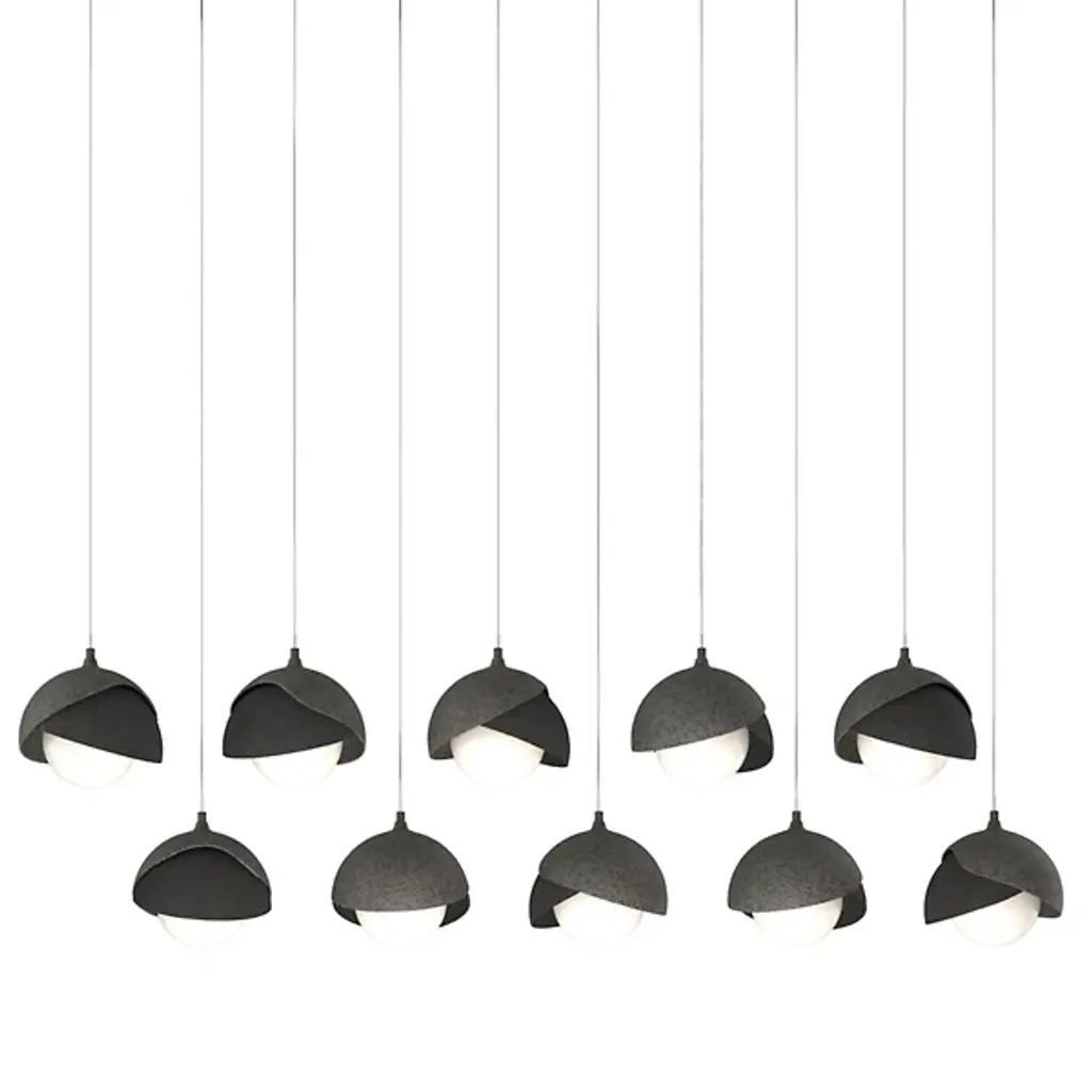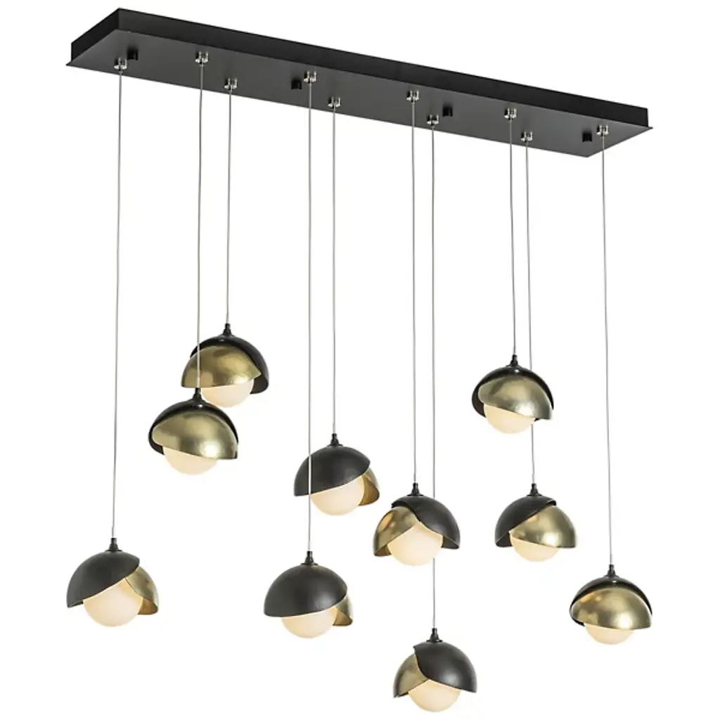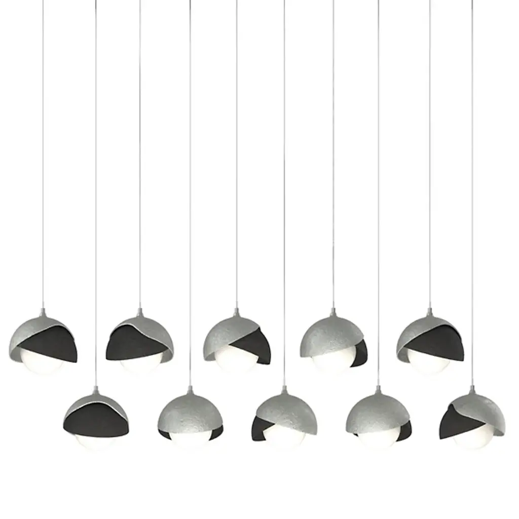 An organic lighting look, with a healthy dose of industrial refinement. Each pendant in the Brooklyn 10-Light Double Shade Rectangular Multi-Light Pendant by Hubbardton Forge has a curved, 2-piece metal shade curving around a glass orb, like a hand-forged pod around a delicate seed. You can customize this multi-light pendant to complement your home’s décor by choosing a different finish for both halves of the shades. Hang all 10 pendants at the same level or in an infinite array of staggered heights to achieve just the right look over a long dining table or kitchen island.