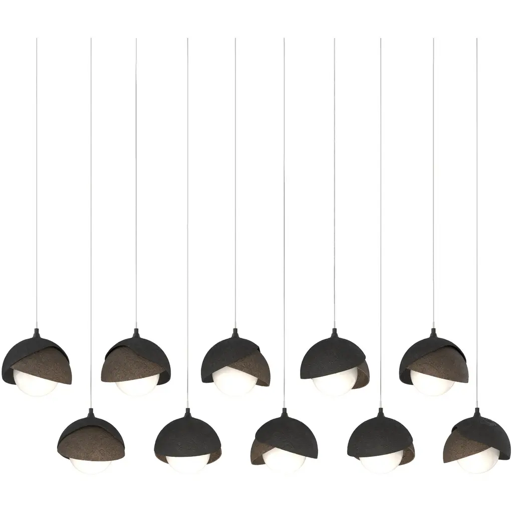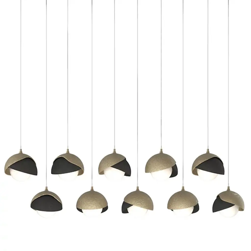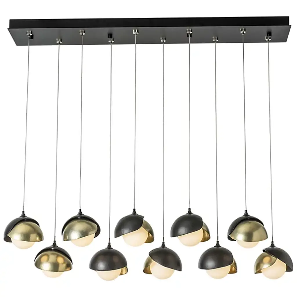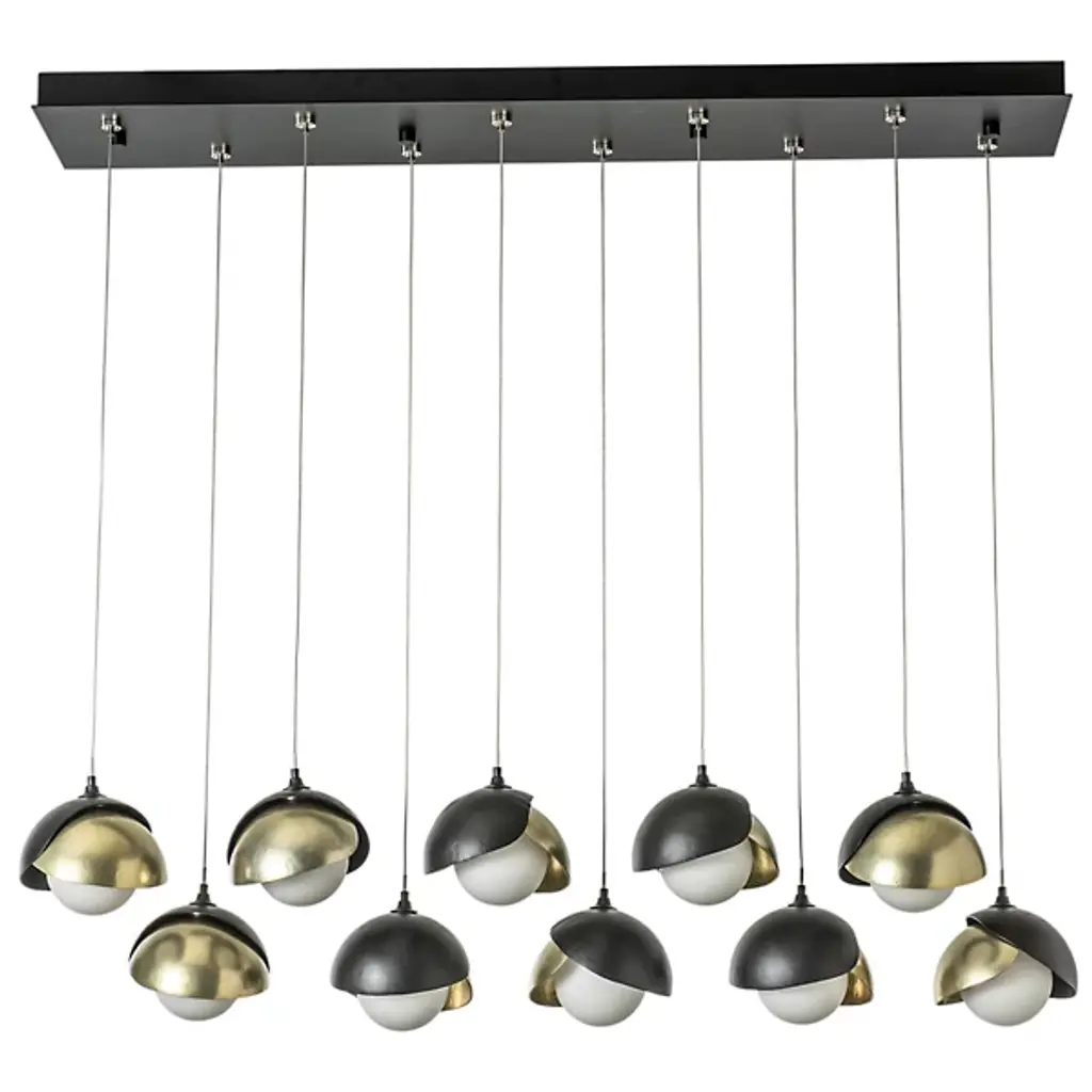 An organic lighting look, with a healthy dose of industrial refinement. Each pendant in the Brooklyn 10-Light Double Shade Rectangular Multi-Light Pendant by Hubbardton Forge has a curved, 2-piece metal shade curving around a glass orb, like a hand-forged pod around a delicate seed. You can customize this multi-light pendant to complement your home’s décor by choosing a different finish for both halves of the shades. Hang all 10 pendants at the same level or in an infinite array of staggered heights to achieve just the right look over a long dining table or kitchen island.