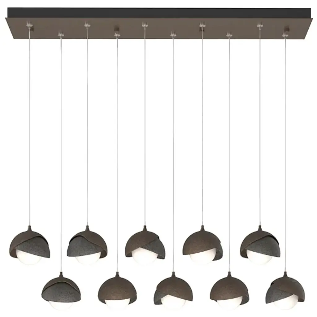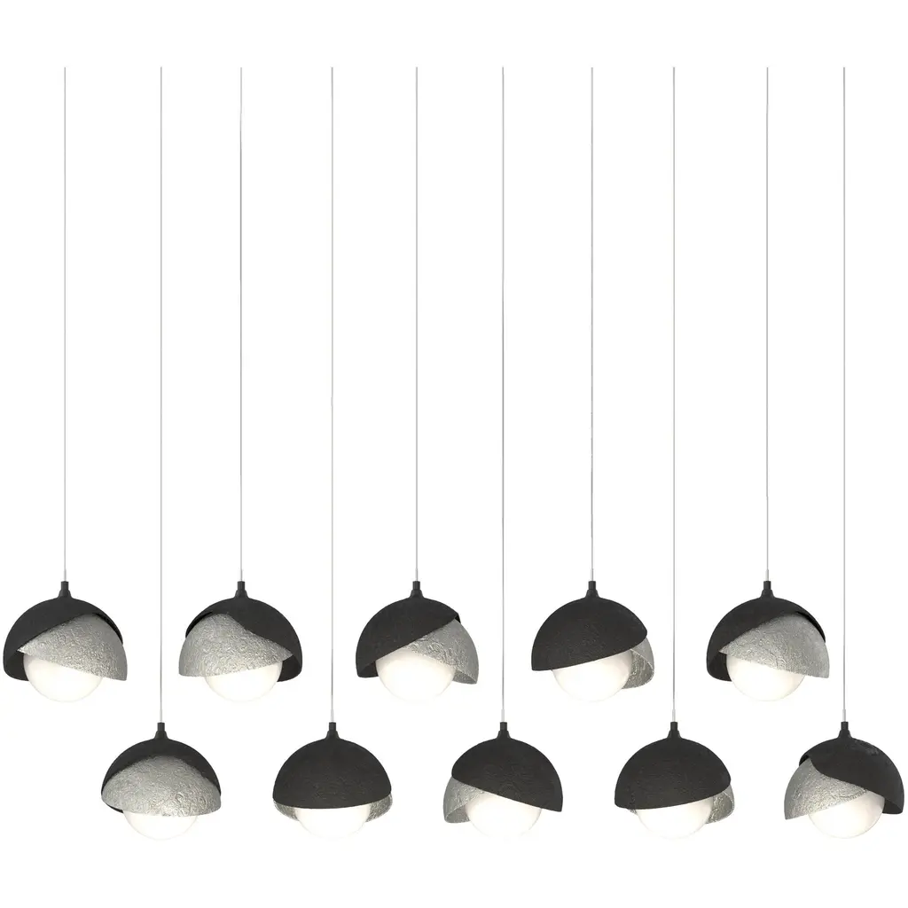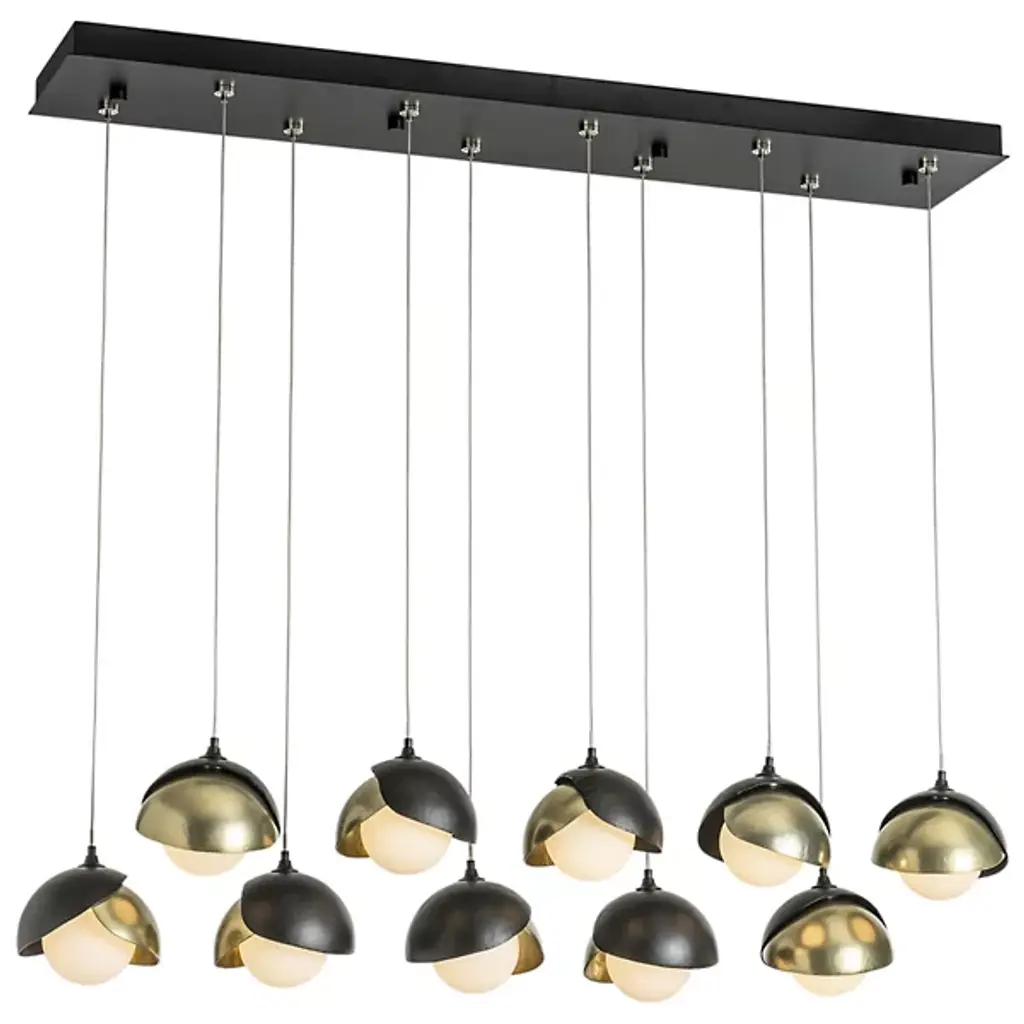 An organic lighting look, with a healthy dose of industrial refinement. Each pendant in the Brooklyn 10-Light Double Shade Rectangular Multi-Light Pendant by Hubbardton Forge has a curved, 2-piece metal shade curving around a glass orb, like a hand-forged pod around a delicate seed. You can customize this multi-light pendant to complement your home’s décor by choosing a different finish for both halves of the shades. Hang all 10 pendants at the same level or in an infinite array of staggered heights to achieve just the right look over a long dining table or kitchen island.