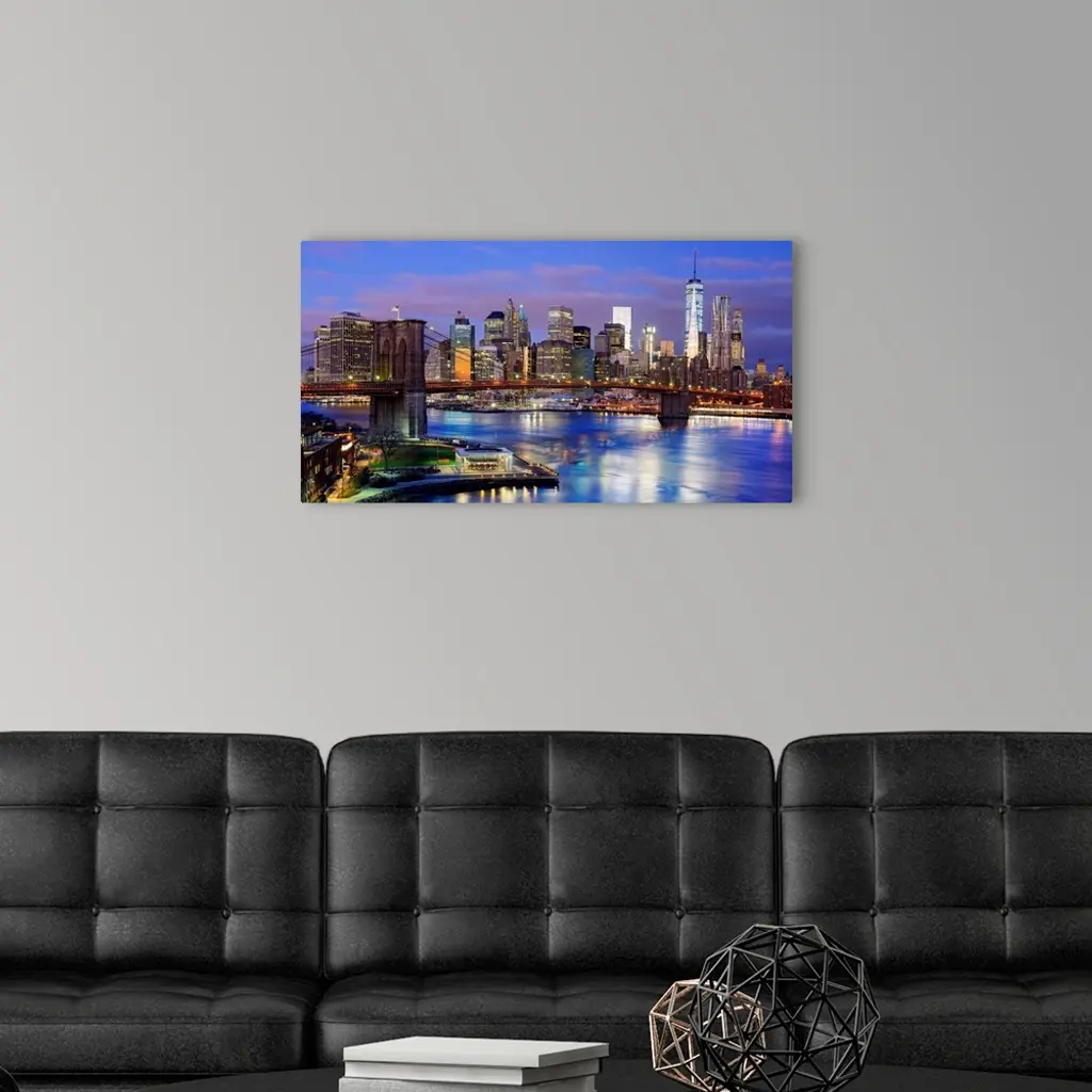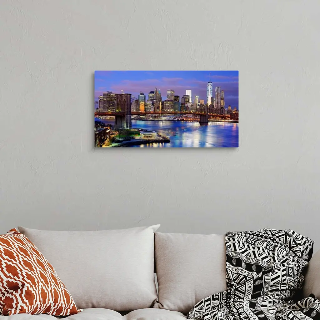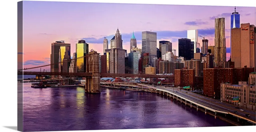 Brooklyn Bridge And Lower Manhattan Panoramic View At Sunset wall art for home and office decor. Discover canvas art prints, photos, mural, big canvas art and framed wall art in GreatBigCanvas.com's varied collections.