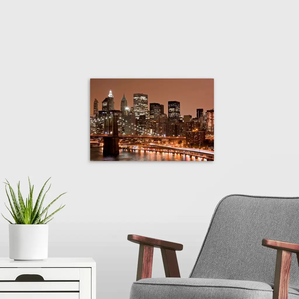 USA, New York, Brooklyn, Brooklyn Bridge at night and East River with Lower Manhattan skyline glowing in distance