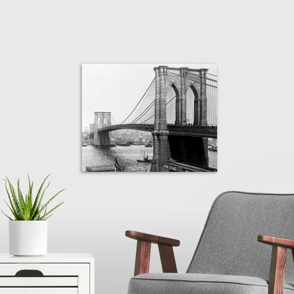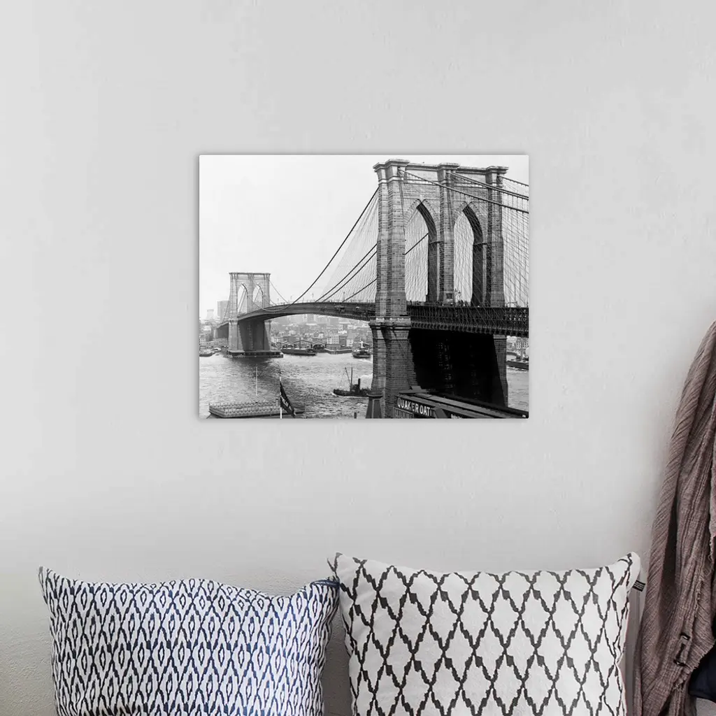 A view of the Brooklyn Bridge which spans across the East River connecting Manhattan Island to Brooklyn. ca. 1900, New York City.