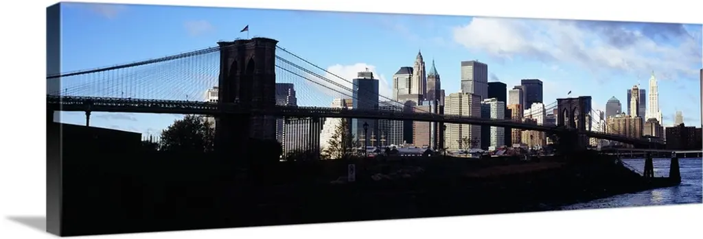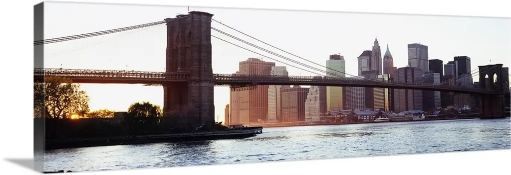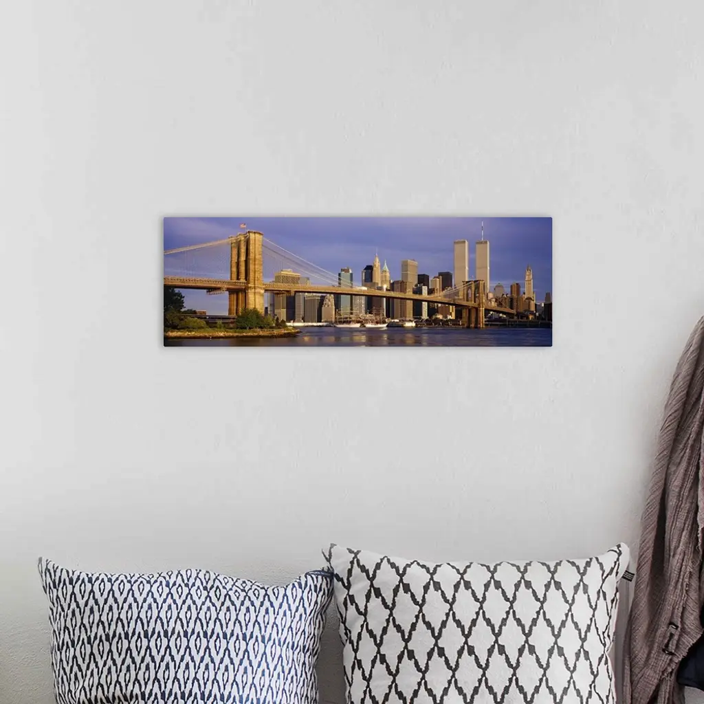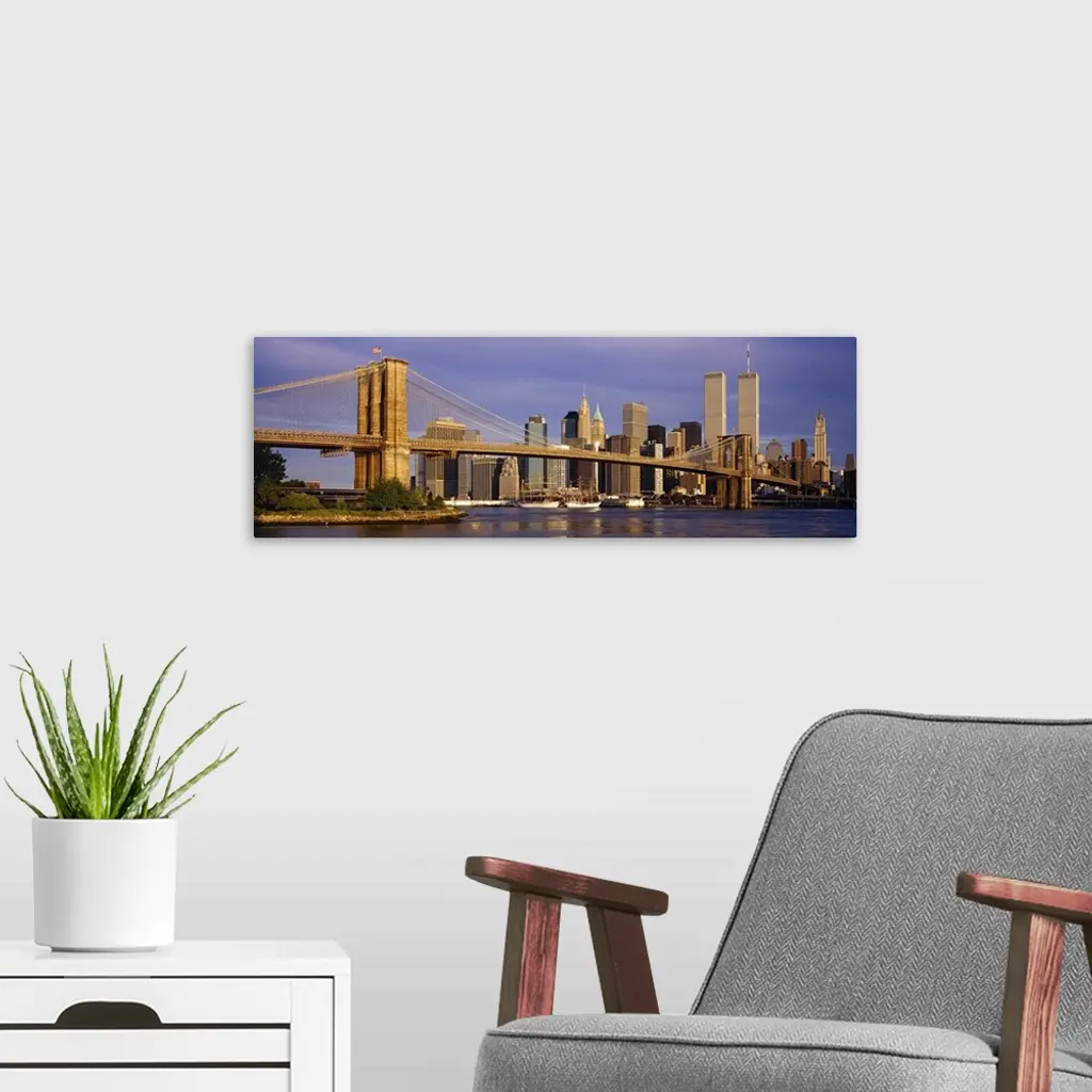 Panoramic, giant photograph of the Brooklyn Bridge in the sunlight, the New York City skyline in the background, including the World Trade Center.