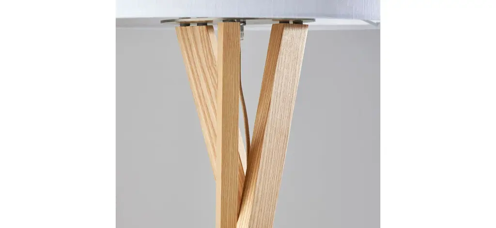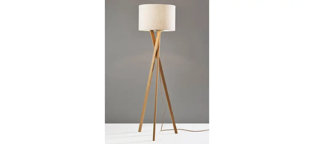 Brighten your room without sacrificing style with the Brooklyn Floor Lamp. With its intertwining tripod design and natural wood construction, this lamp is the perfect accompaniment to farmhouse, coastal, or Scandinavian decor. The minimalist design of the tripod base has an added touch of flair, as the three legs elegantly intertwine as they reach for the lamp shade. The drum shade is crafted of textured linen to softly disperse the light from a 150W bulb.