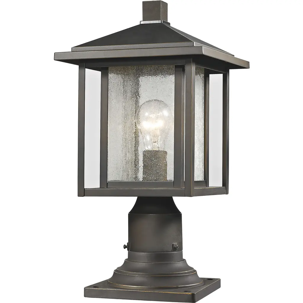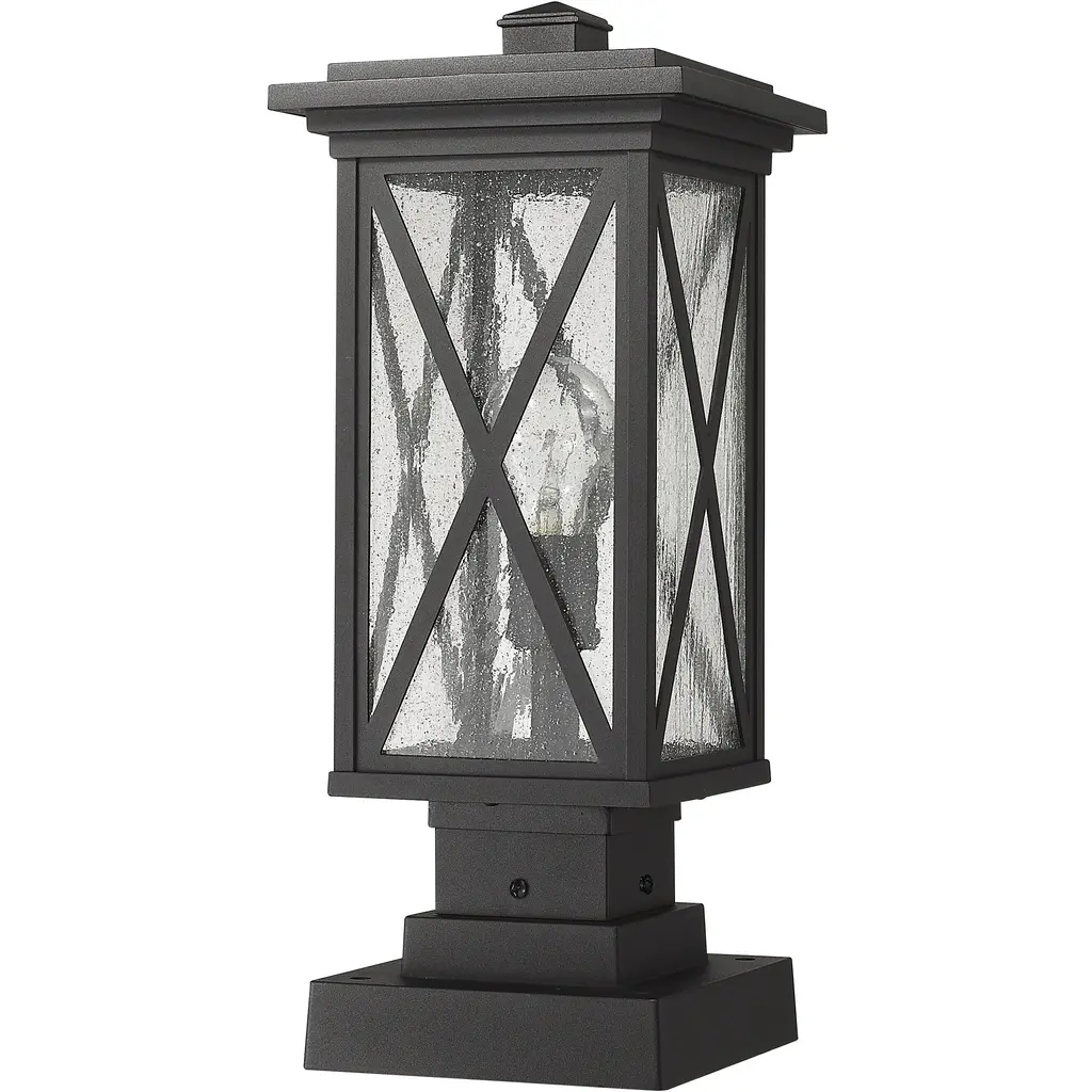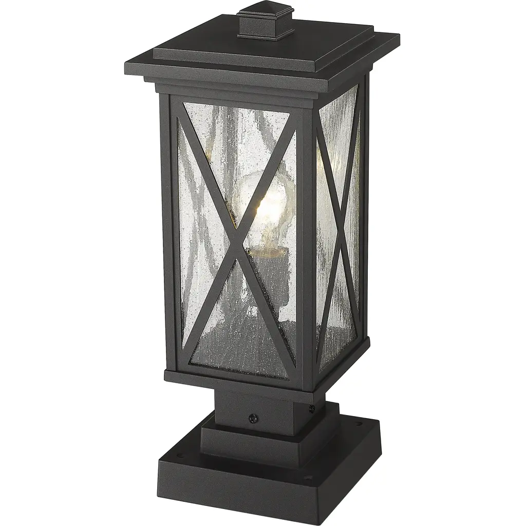 This one-light outdoor pier mounted fixture has a broad, square-shaped, tiered base, and comes in a box-shaped black aluminum cage with a clear seedy glass finish. Compelling X-accents bring dimension and character. It softly diffuses light to provide a welcoming glow to your front entrance or patio.
