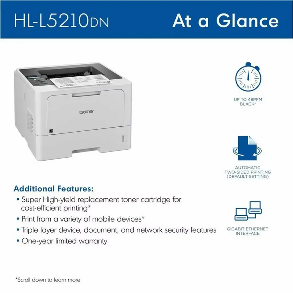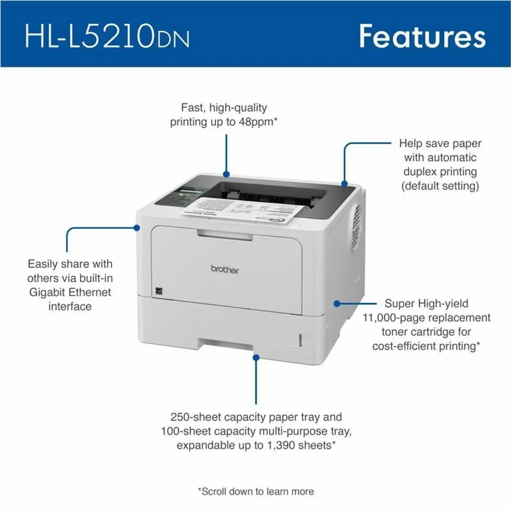 The Brother HL-L5210DN monochrome laser printer is designed for businesses and small workgroups that prioritize efficient printing and flexible paper handling. With a fast print speed of up to 48 pages per minute, it enables users to produce high-quality documents swiftly, driving productivity. Additionally, its security features protect against unauthorized access, while its expandable paper capacity accommodates growing office needs. This printer supports networking via Gigabit Ethernet, allowing connectivity among multiple users and ease of access across various mobile devices.