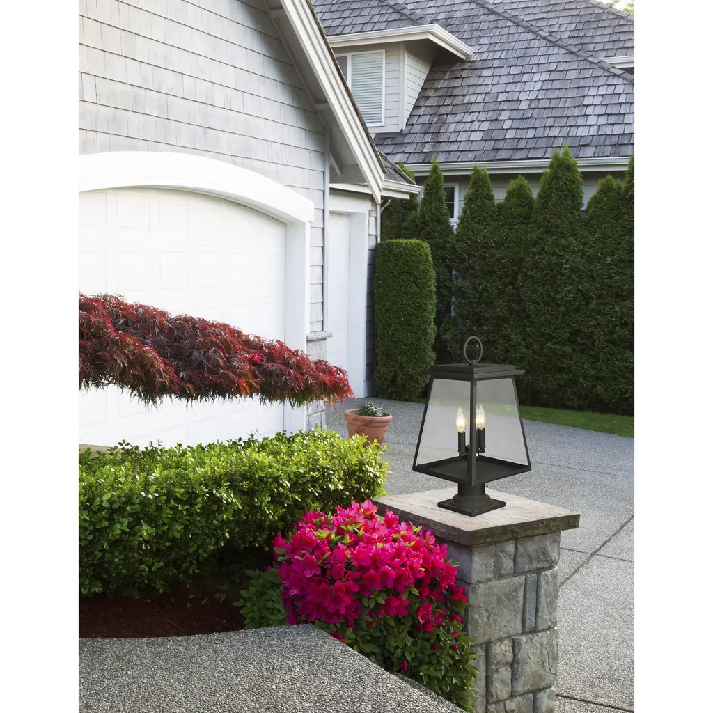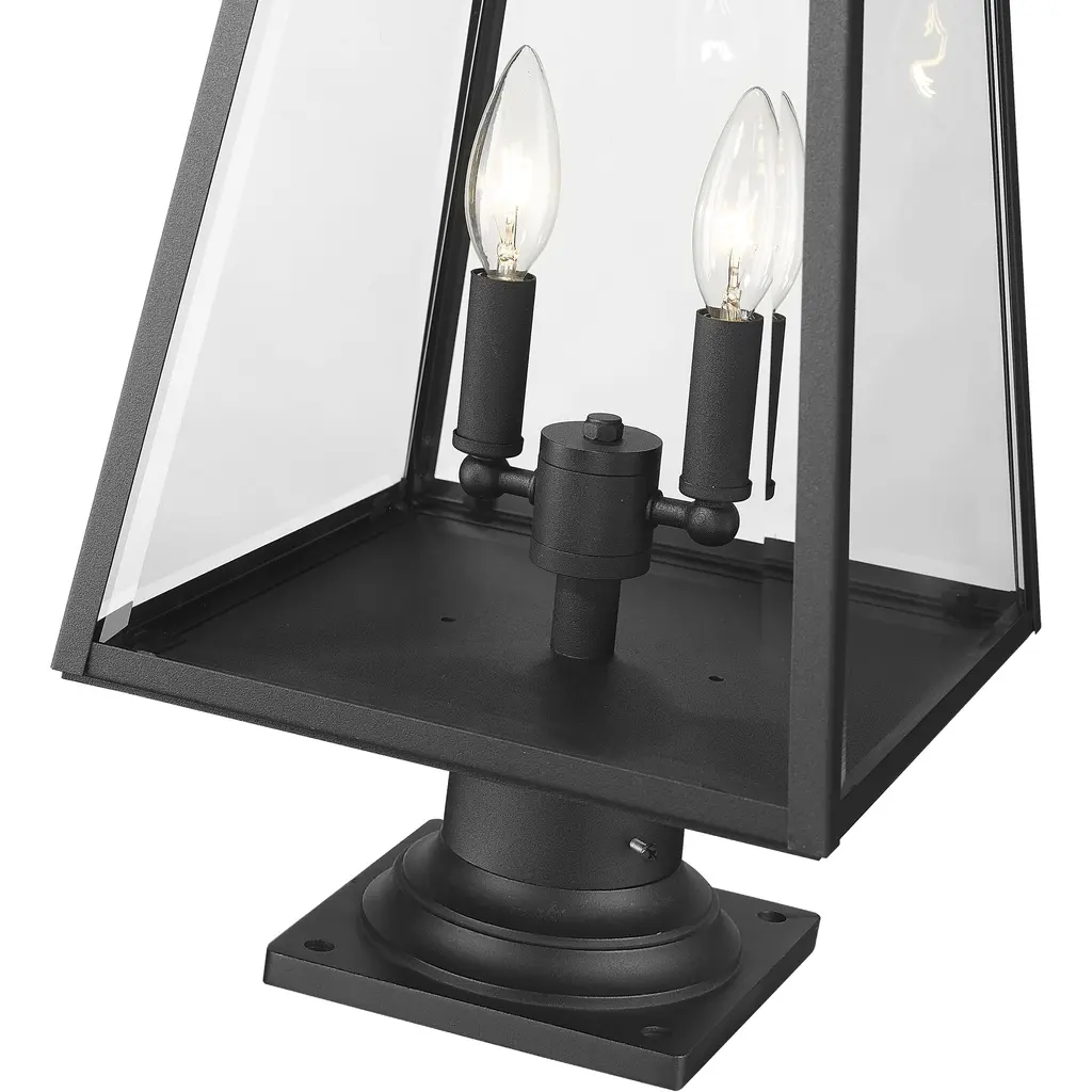 Add the romantic aesthetic of village nautical to a garden or walkway space with this classic light element. From the Broughton collection, this two-light outdoor pier-mounted fixture offers construction of sleek black aluminum and clear beveled glass panels on its lantern-style shade. Charming candelabra bulb mounts seal the deal on a tasteful look.