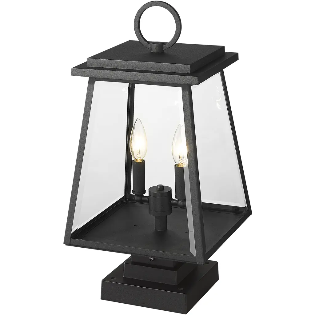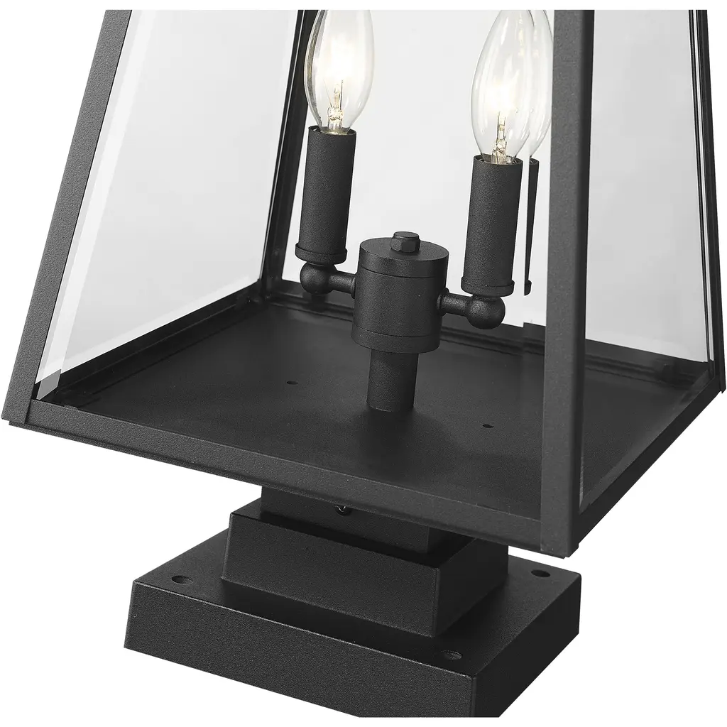 Indulgent village nautical charm returns to a storied early 20th Century vibe as it creates elegance in a garden or walkway space. From the Broughton collection, this two-light outdoor pier-mounted fixture offers construction of sleek black aluminum and clear beveled glass panels on its lantern-style shade. Charming candelabra bulb mounts and a crisp layered base seal the deal on a tasteful look.