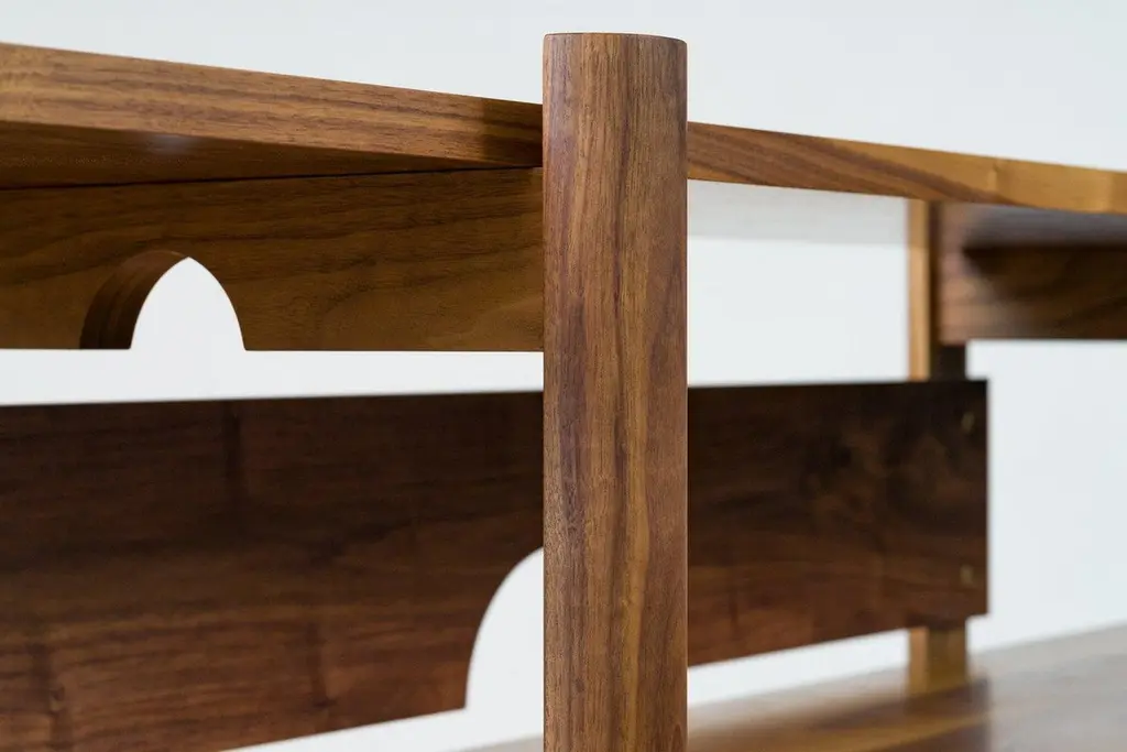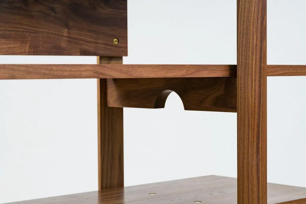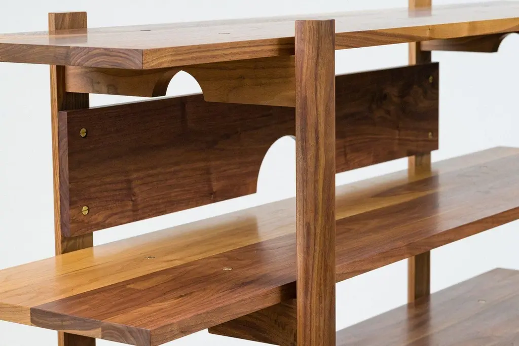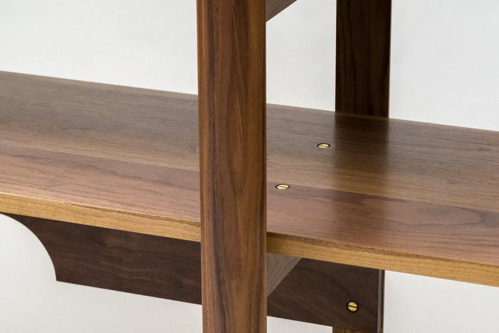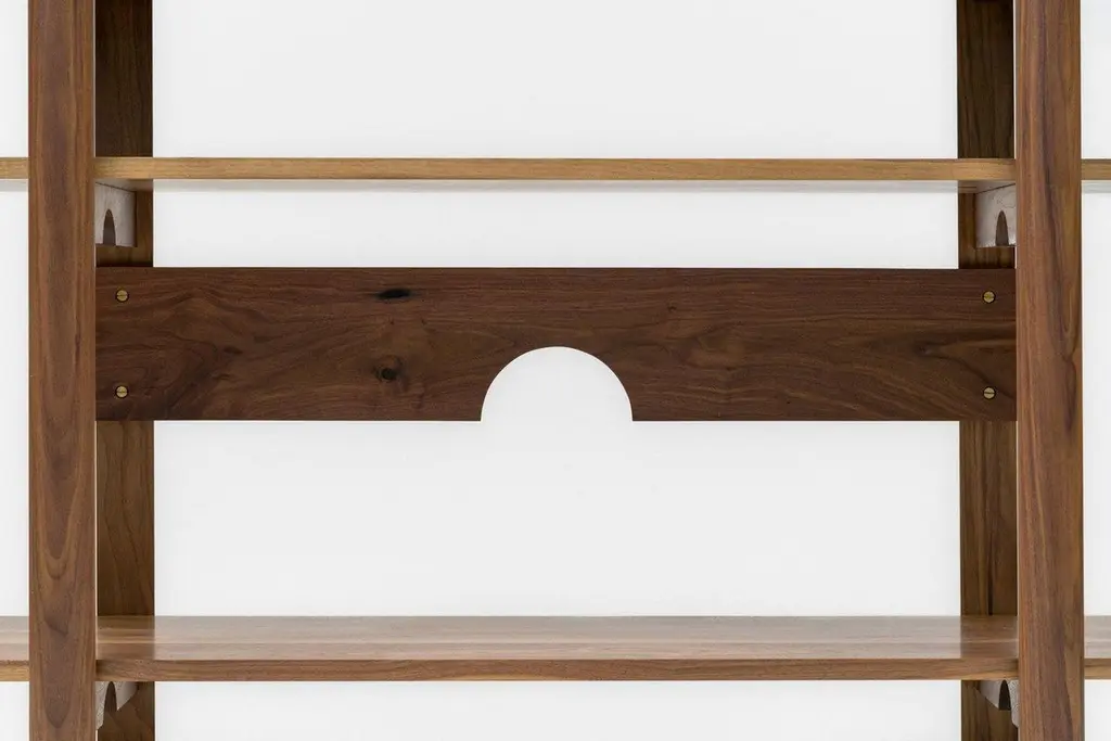 Six solid wood shelves supported by two sets of half-round uprights make up the Brower Shelves. An open storage solution for those looking for a simple, minimal organization system for all the necessities you want to keep in view and close at hand. Thick, solid brass hardware makes for stable, solid connections able to support a heavy library with ease. A contemporary design made using old world, traditional techniques; comfortable in both the modern and traditional home. Finished with our own special recipe of oil and wax and painstakingly hand rubbed for an unsurpassed touch and feel.Pictured in walnut with hand-rubbed oil and wax finishNew