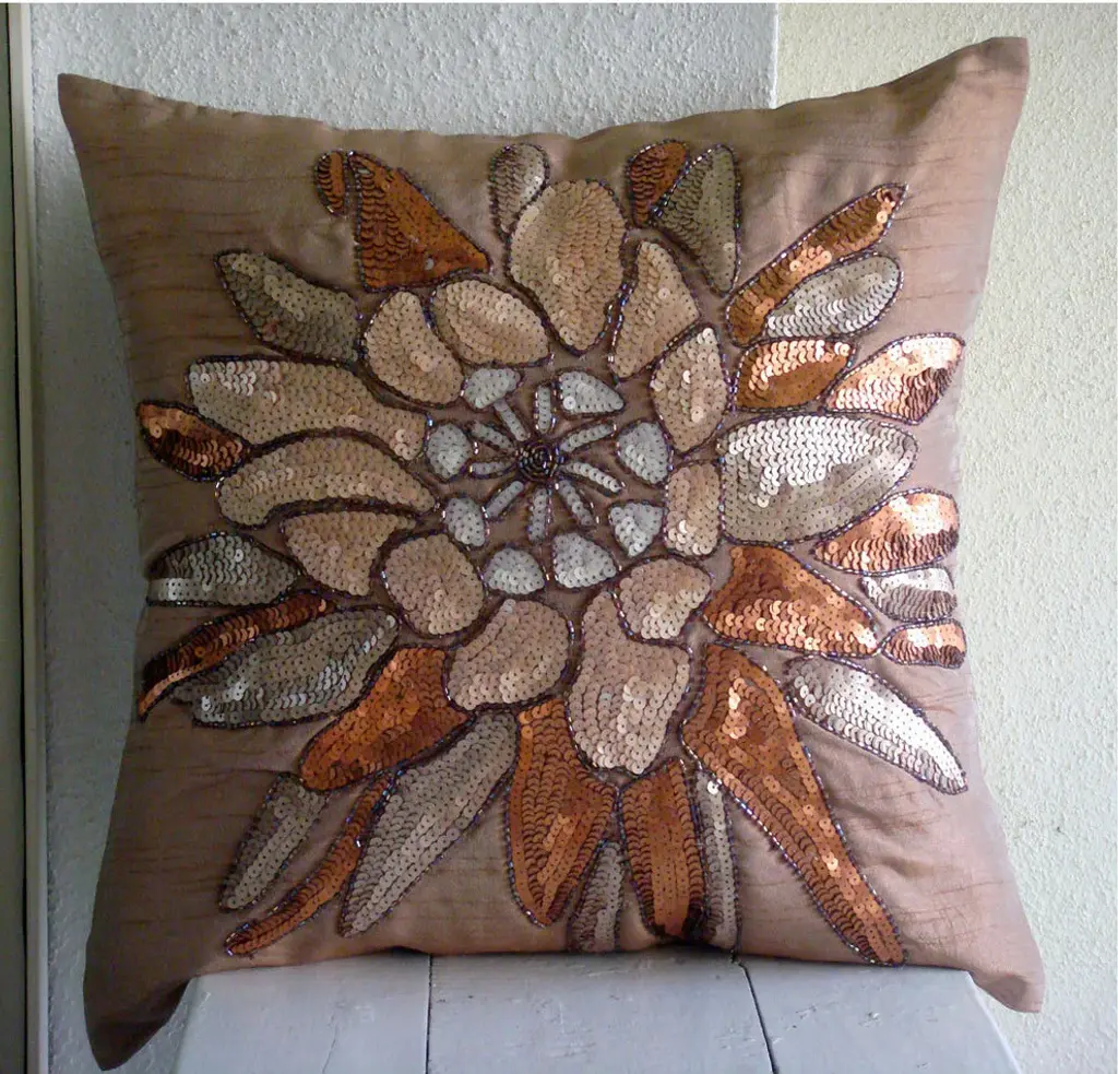 Brown Art Silk 16"x16" Sequins & Beaded Flower Pillows Cover, Spark Attraction