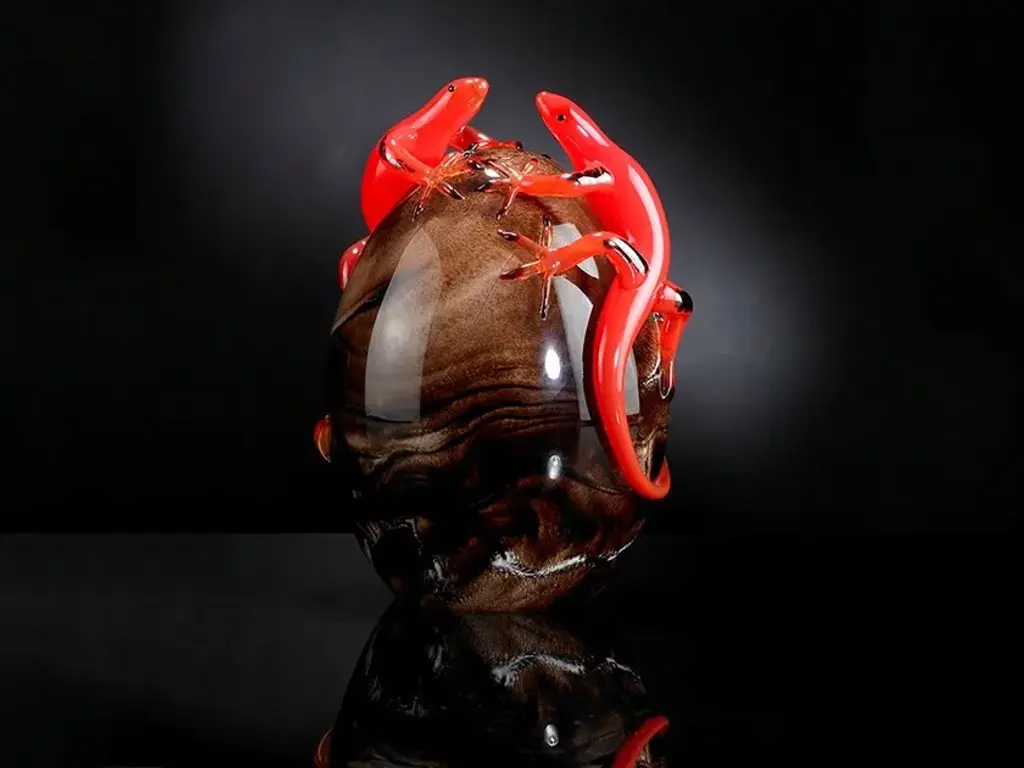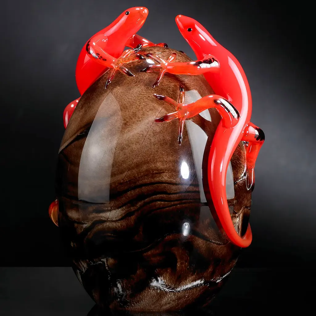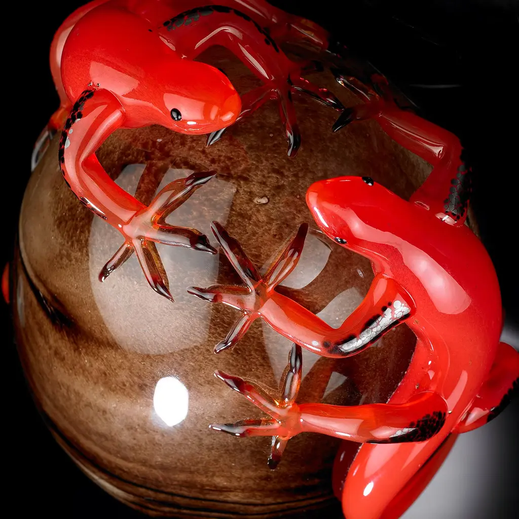 Making a lively and singular addition to a modern console, sideboard, or coffee table, this glass figurine comprises a small egg enhanced with mesmerizing brown hues, and two red geckos holding tight onto its polished surface while looking into each other's eyes.