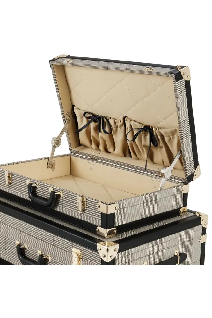 This beautiful set of 3 Bittersweets Trunks is great for storage and decoration. These vintage-style suitcases. Each case features a check brown upholstery and is finished with black leather-look straps. Brass hardware adds to the retro look.