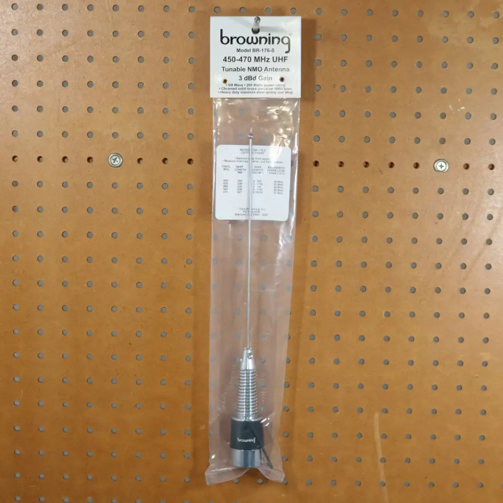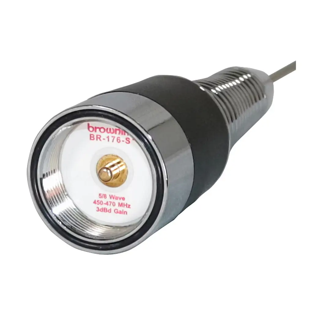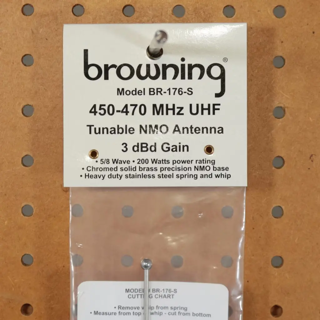 Amplify your signal with Browning. The 200 Watt 450 MHz to 470 MHz 3-dBd-Gain UHF Antenna with Spring and NMO Mounting features a 5/8 wave and a 13 in. high stainless steel tapered whip. It also has a gold plunger-type contact pin and a premium coil with metal base and top.