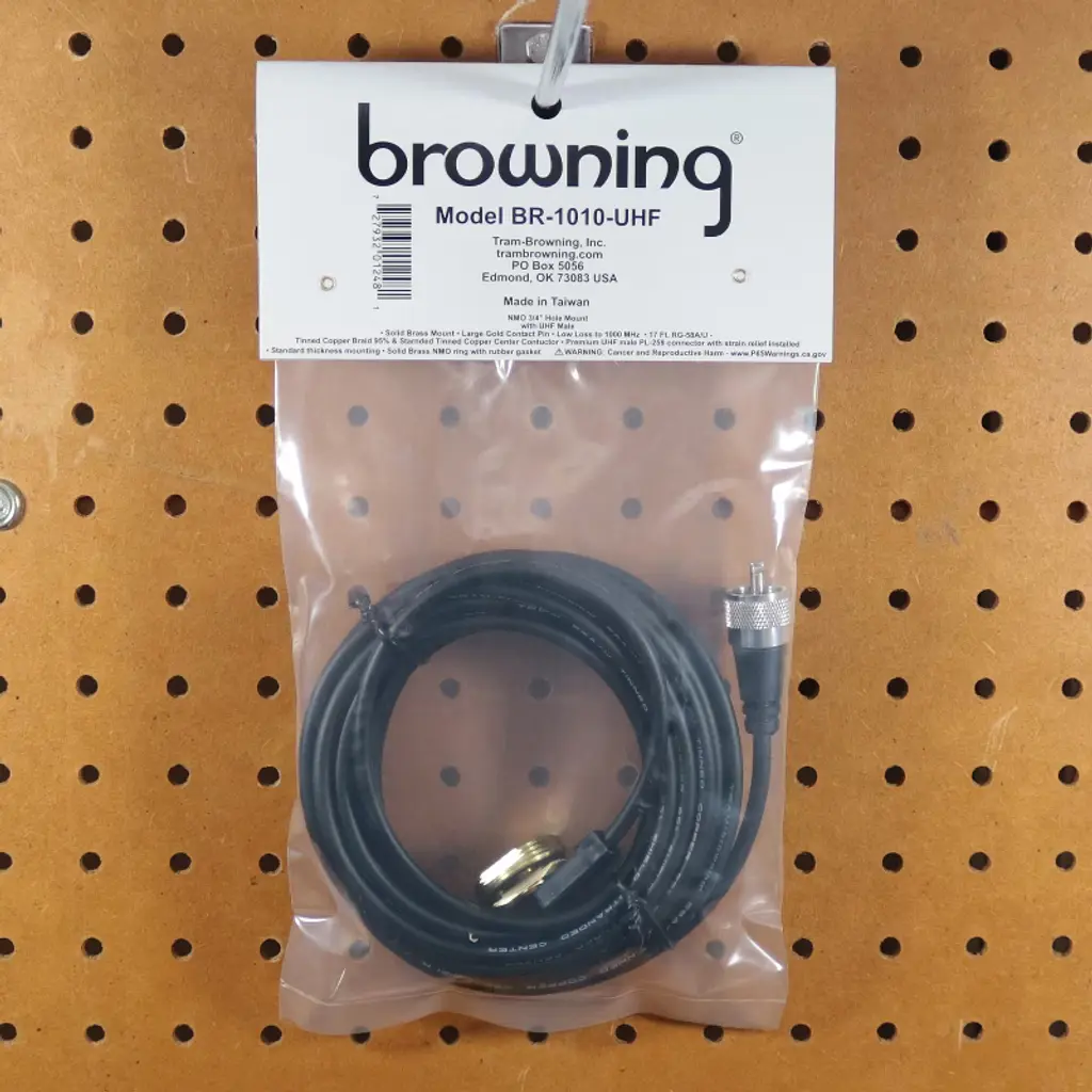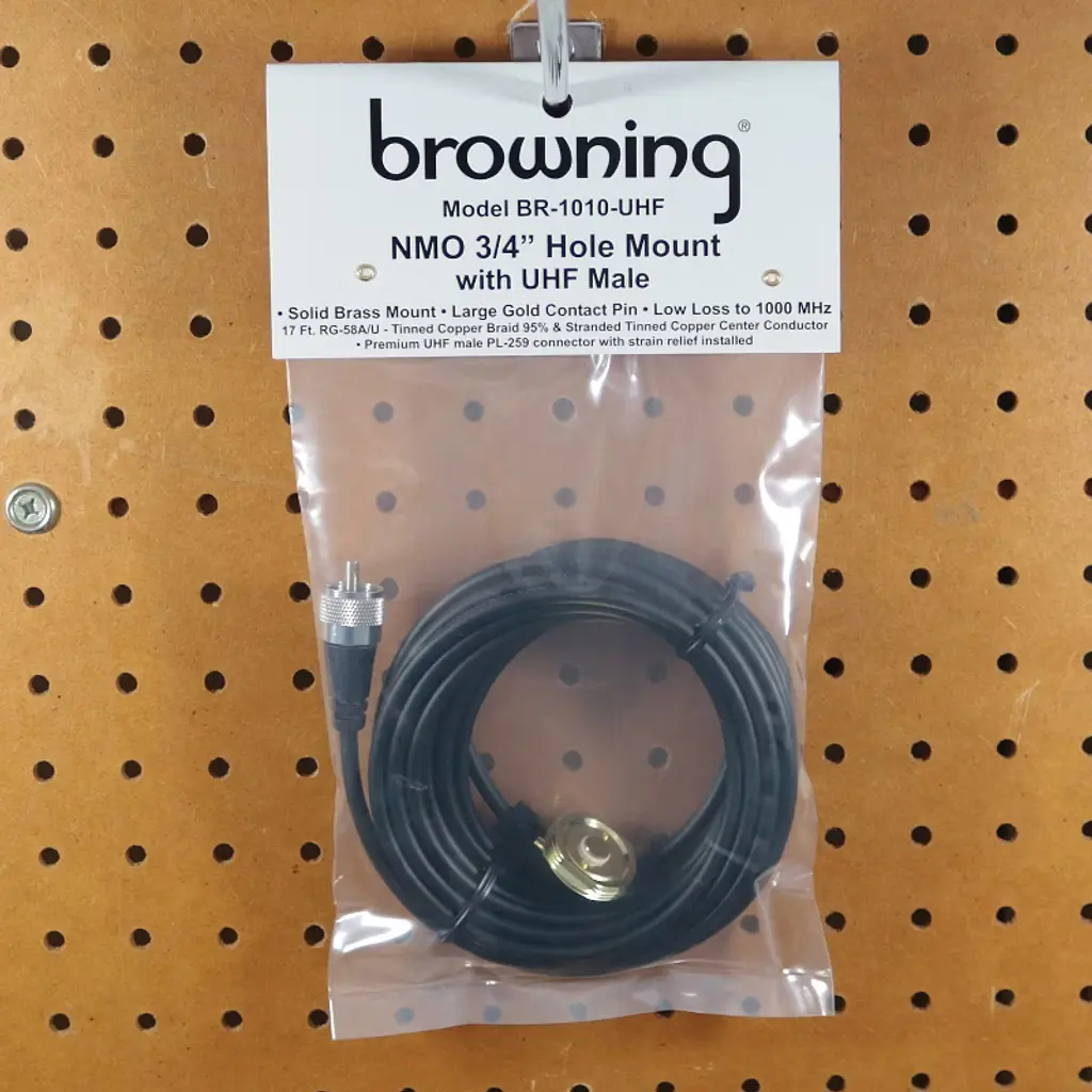 This 3/4 in. NMO Hole Mount from Browning is a standard thickness mount made of solid brass mount with a gold contact pin. A UHF Male PL-259 Connector with strain relief has already been installed. It also has a 17 ft. RG-58 A/U cable with tinned copper braid 95% and a stranded, tinned copper enter conductor.