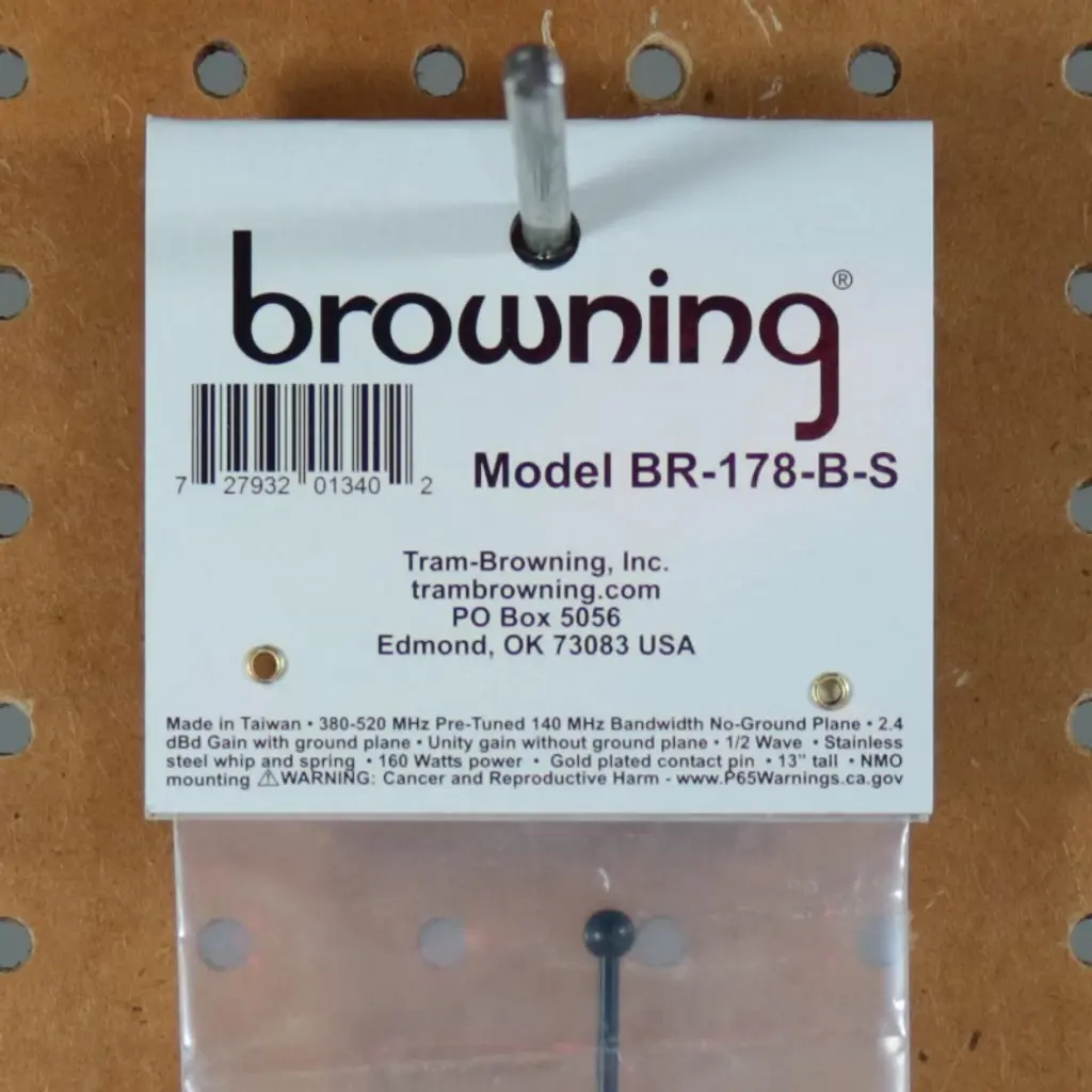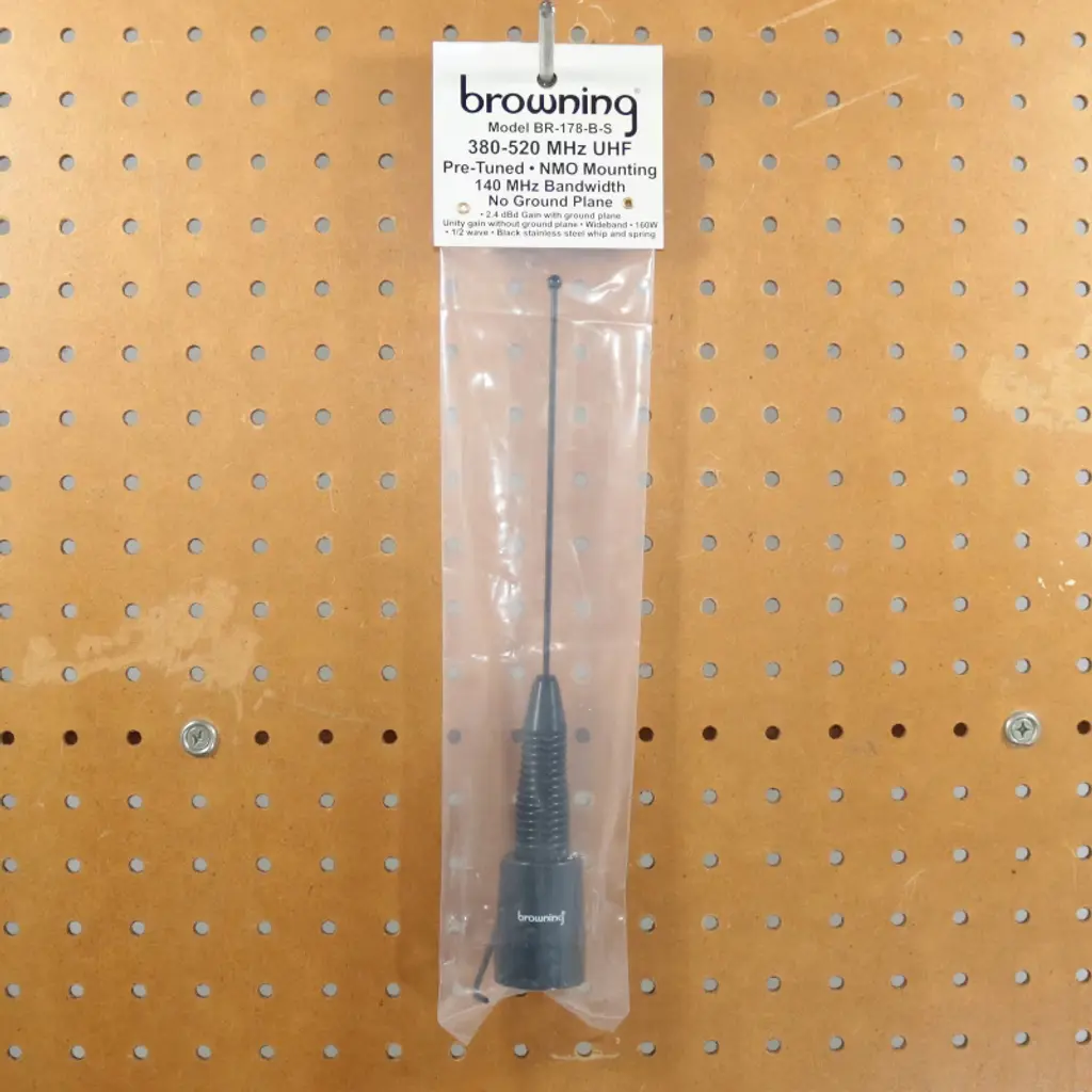 This Browning Black 160-Watt Wide-Band 380 MHz to 520 MHz Antenna with NMO Mounting has a 140 MHz bandwidth. It has solid brass bushings and a gold plunger-type contact pin. The antenna with its 2.5 mm tapered stainless steel whip has an overall height is 11 in. Mount sold separately.