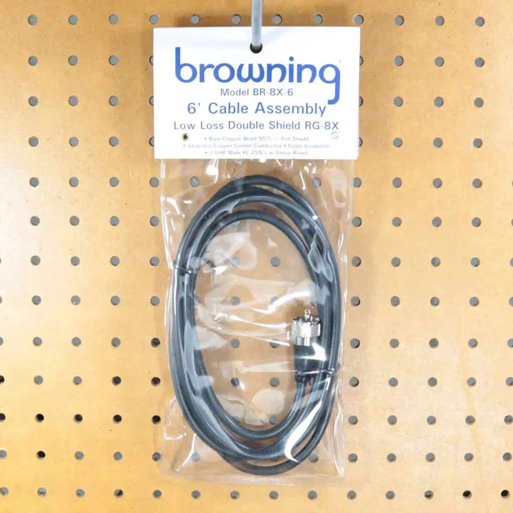 The 6-ft. Browning® BR-8X6 low-loss double-shield coax cable is designed to deliver superior performance. This cable features a 95% bare copper braid combined with a full aluminum foil shield, ensuring minimal signal loss and maximum reliability. Inside, you'll find a stranded bare copper center conductor, all encased in foam insulation for enhanced durability. The black PVC jacket not only provides an attractive finish but also protects the cable from wear and tear. Each end of the cable is equipped with a UHF male PL-259 connector, making it easy to connect to your devices. With this coax cable, you can expect optimal signal quality and a robust connection for all your communication needs.