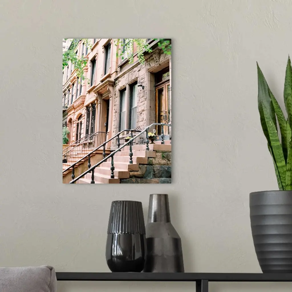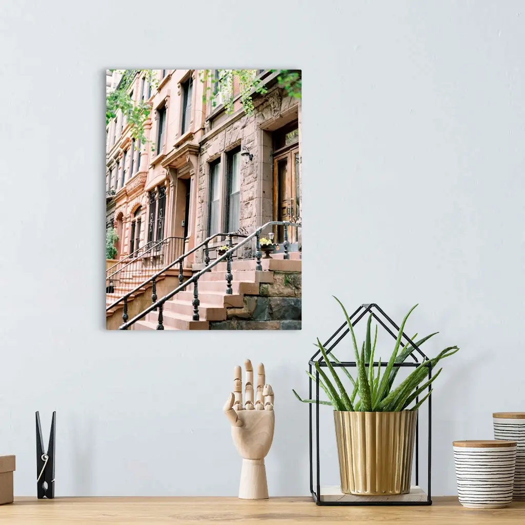 Photograph of brick and cement steps leading up to an iconic Brownstone house in New York.