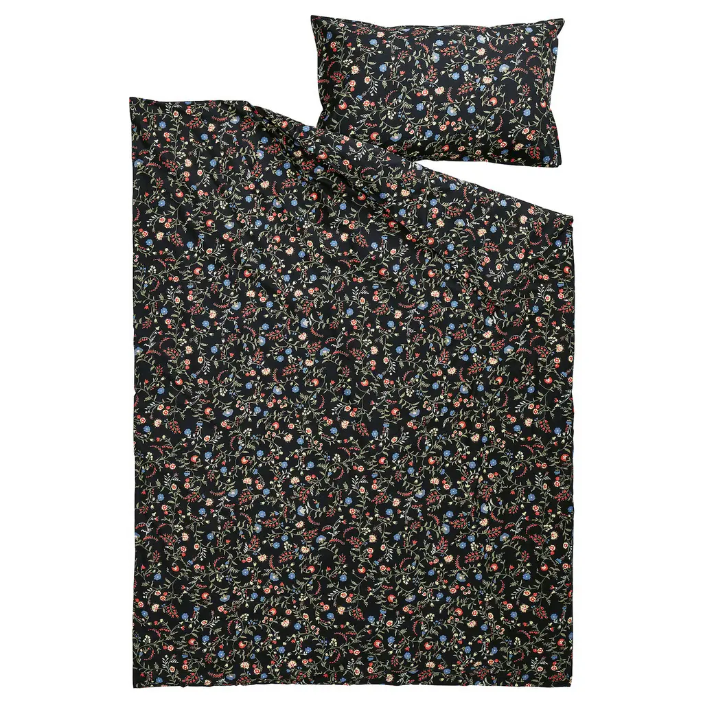 BRUDKRUSBÄR Duvet cover and pillowcase(s) - black multicolor/floral pattern Twin. Comprises of 100% organic cotton certified by GOTS - the Global Organic Textile Standard. Cotton is a soft, natural material that breathes, absorbs moisture and feels comfortable against your skin.