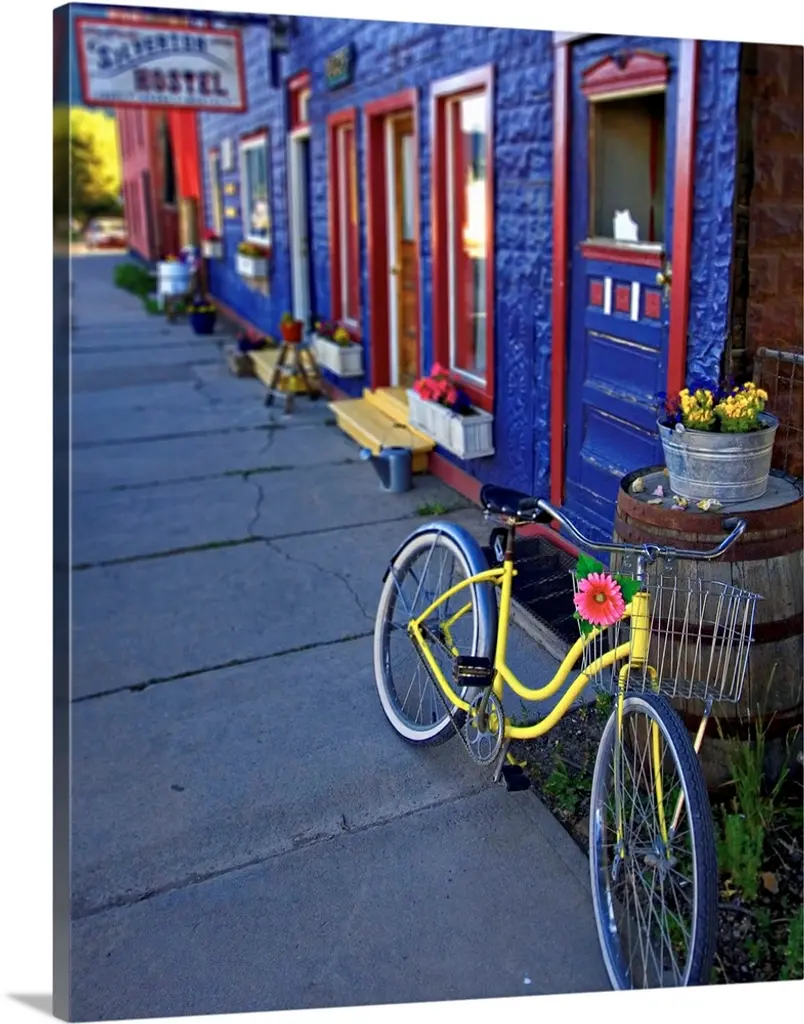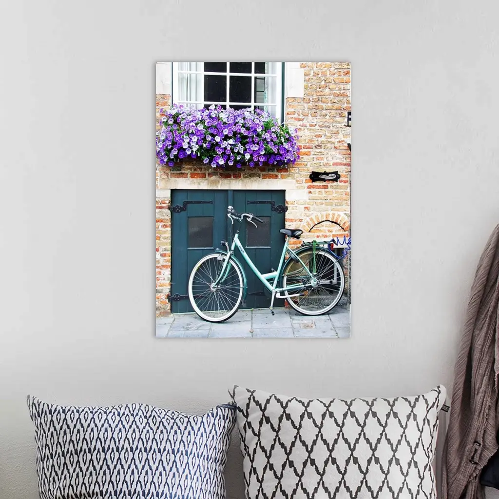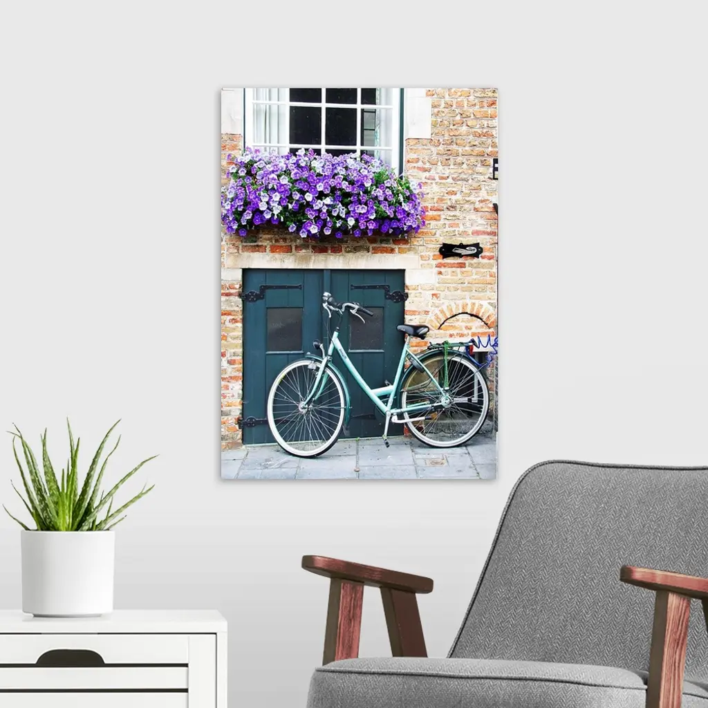 A bicycle parked near a small door with a flowerbox full of purple flowers overhead.