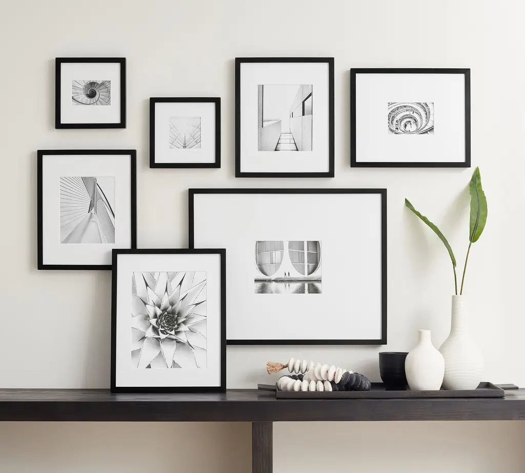 We've gathered together nine frames in four different sizes to make it easy to create a stunning gallery wall of favorite photographs. Brushed gunmetal frames make a fantastic presentation, featuring shadow-box styling and generously sized off-white mats. Set includes two 3-4x6, four 5x7, two 8x10, and one 11x14 frames.