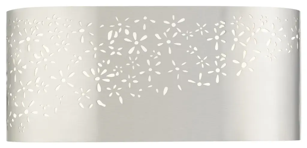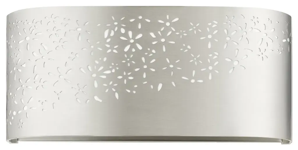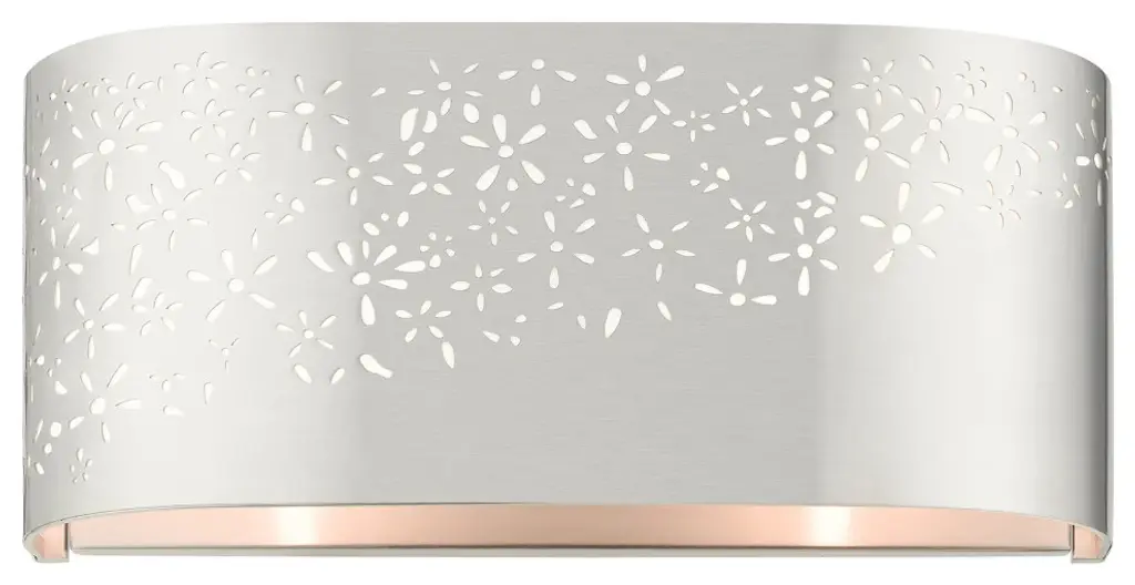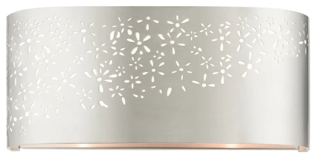 The Noria collection combines an intricate organic laser cut brushed nickel finish steel frame which surrounds an off-white fabric shade creating a casual warm light with a touch of nature vibe. This two-light vanity sconce will have a definitive presence in many areas of your home. You can place it in the living room, hallway, bathroom or bedroom. Hang this piece vertically or horizontally.Bulb Type: Candelabra BaseNumber of Bulbs: 2Bulbs Included?: NoUL Listed: ETLBulb Wattage: 40Hardwire or Plug: Hardwire