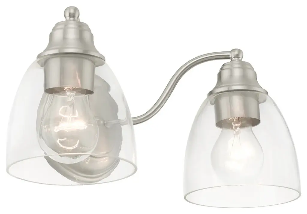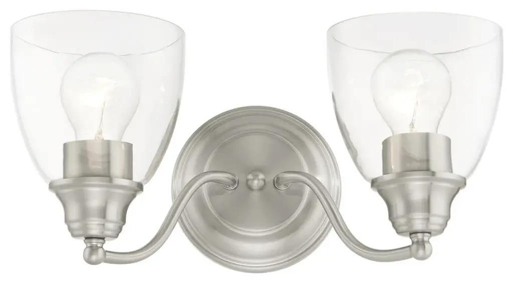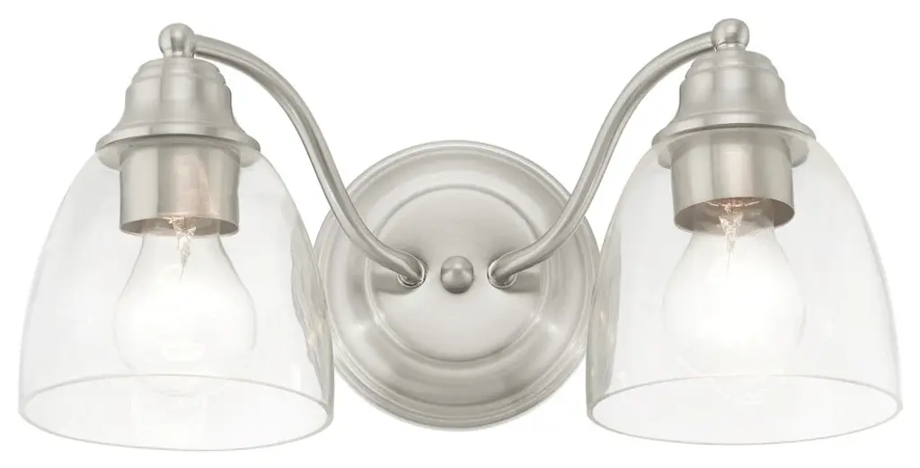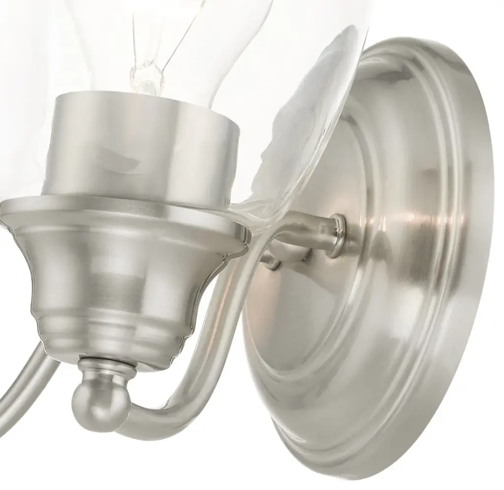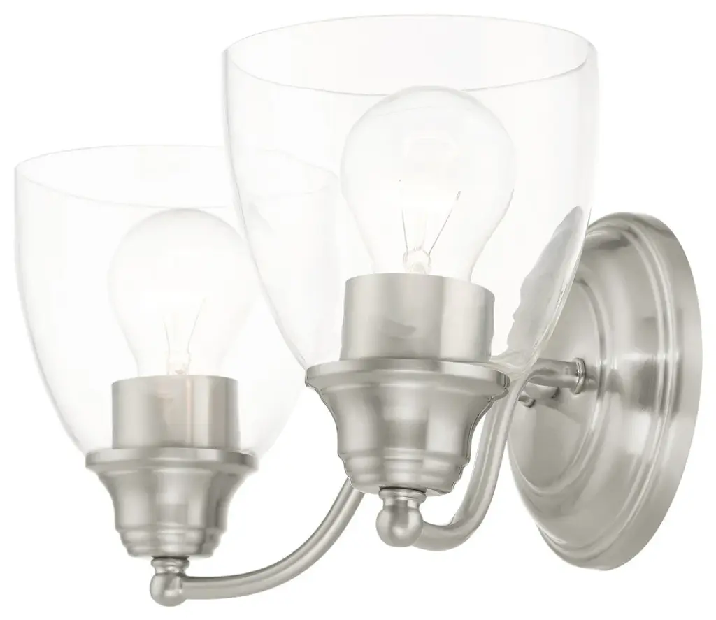 Whether it''s style or practical lighting, this vanity sconce is the perfect addition to your bathroom. This two-light fixture from the Montgomery Collection features clear hand-blown glass shades and is shown in a brushed nickel finish. The clean graceful lines of the back plate complement the shades, creating an understated look that works well in most decors. Classic elegance combines with contemporary appeal to enhance any home in style.Bulb Type: Medium BaseNumber of Bulbs: 2Bulbs Included?: NoUL Listed: ULBulb Wattage: 100Hardwire or Plug: Hardwire
