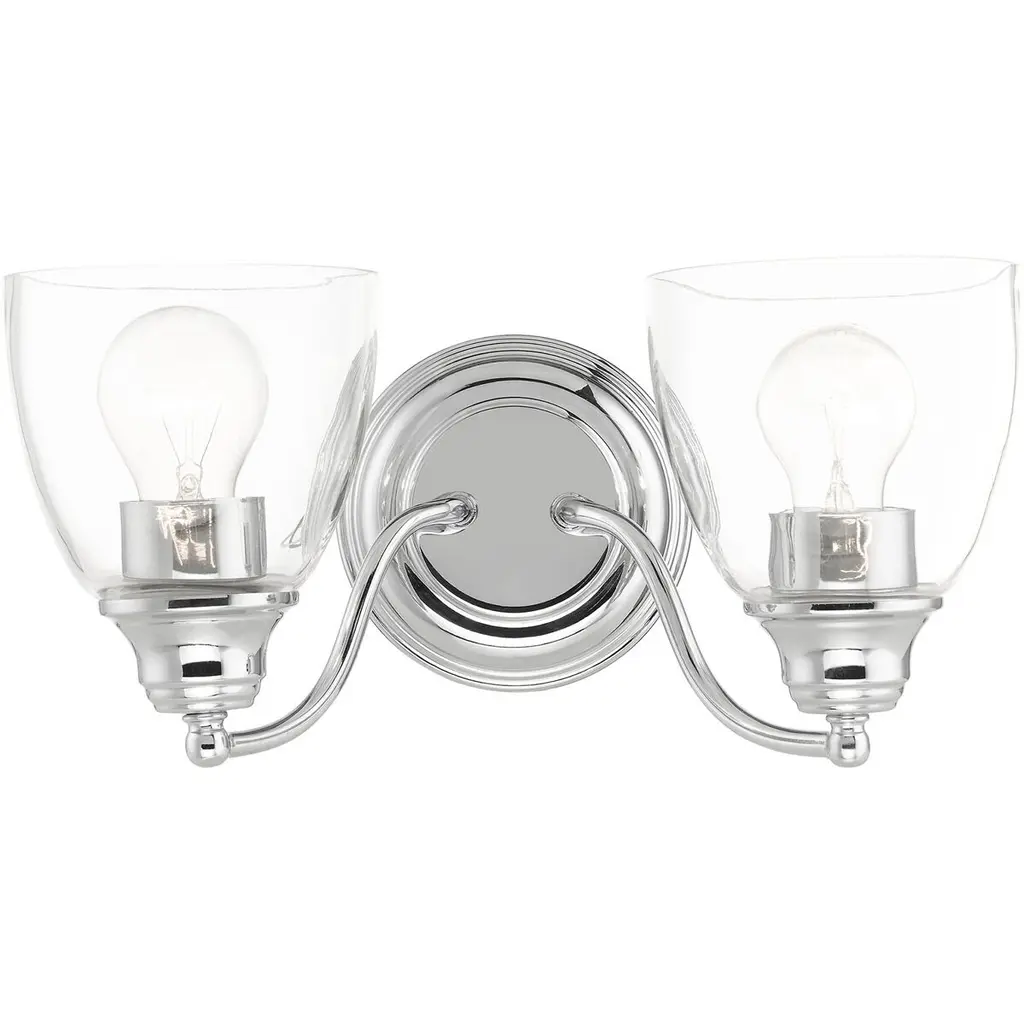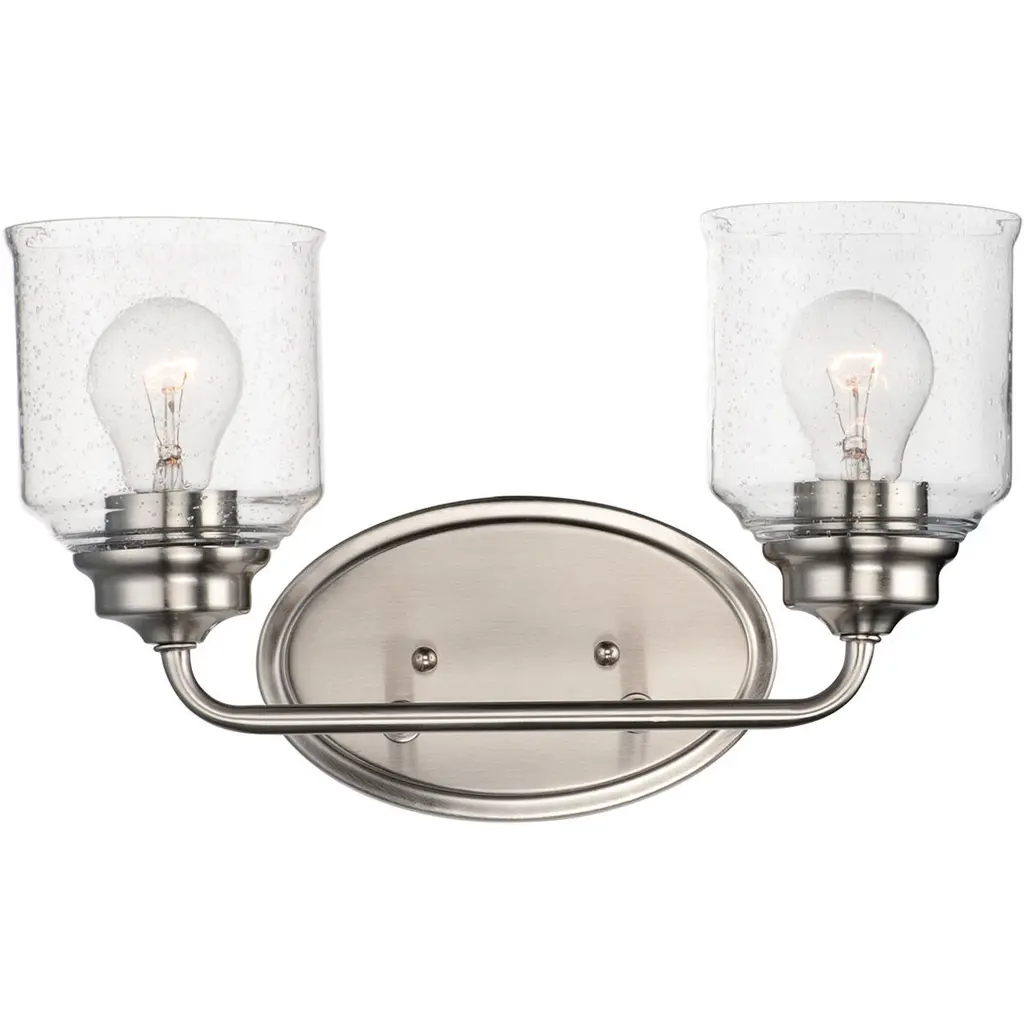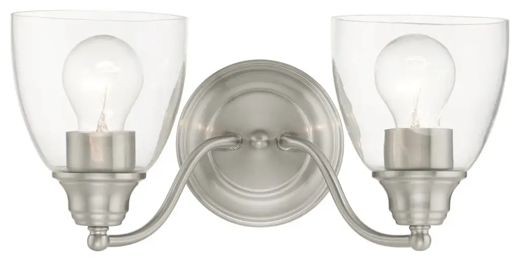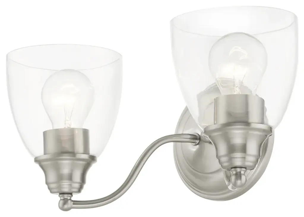 Whether it''s style or practical lighting, this vanity sconce is the perfect addition to your bathroom. This two-light fixture from the Montgomery Collection features clear hand-blown glass shades and is shown in a brushed nickel finish. The clean graceful lines of the back plate complement the shades, creating an understated look that works well in most decors. Classic elegance combines with contemporary appeal to enhance any home in style.Bulb Type: Medium BaseNumber of Bulbs: 2Bulbs Included?: NoUL Listed: ULBulb Wattage: 100Hardwire or Plug: Hardwire