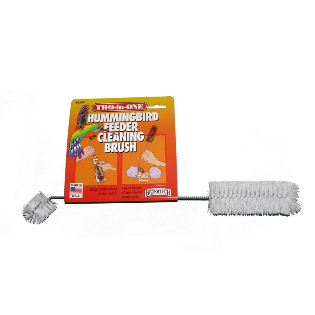 Keep your backyard buzzing with healthy hummingbirds by using the Brushtech Two-In-One Hummingbird Feeder Cleaning Brush. Designed to simplify feeder maintenance, this dual-head brush features both a long, sturdy nylon bristle head for scrubbing nectar bottles and a precise, small brush to reach deep into feeder sockets. Built for efficiency and durability, this brush allows bird lovers to maintain feeder hygiene with ease. Routine cleaning is vital—hummingbird feeders can accumulate sticky nectar residue and dangerous mold that threaten bird health. That’s why this ergonomic bird feeder brush makes a smart addition to any backyard bird supply kit. The handle offers comfortable grip and control, while the rugged bristles handle tough cleaning tasks with confidence. Made in the USA, this brush is a heavy-duty cleaning tool built for regular use. Whether you're scrubbing a long-neck nectar bottle or clearing a narrow socket, this versatile brush gets the job done. Designed for use 2 to 3 times per week, it ensures your feeder remains a safe haven for your fast-winged visitors. Make your bird feeder maintenance easier and more effective with a brush that’s as hardworking as you are. Trust Brushtech for hummingbird care tools designed with function, durability, and convenience in mind.