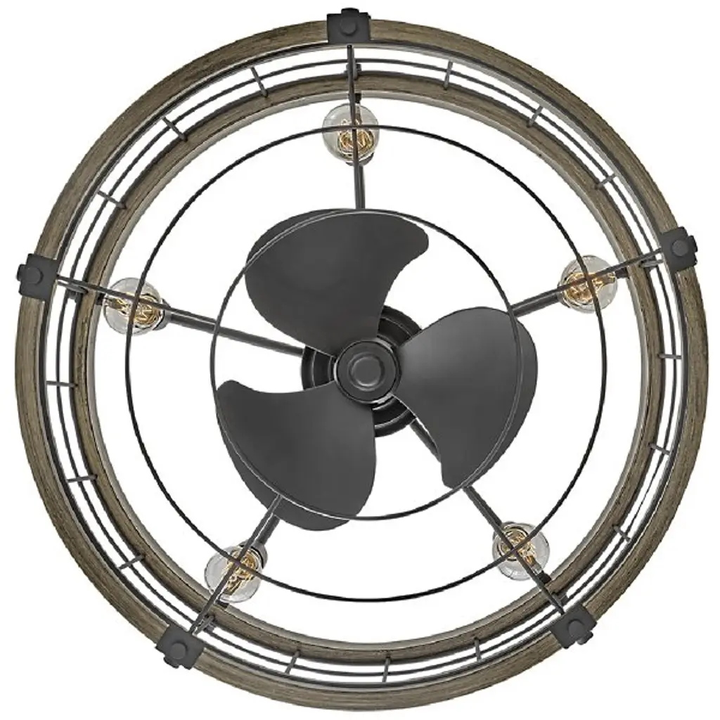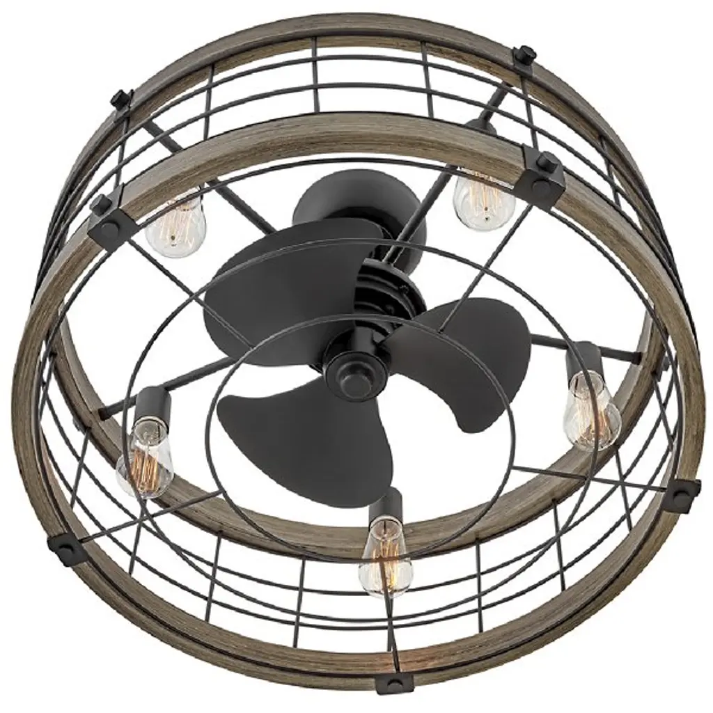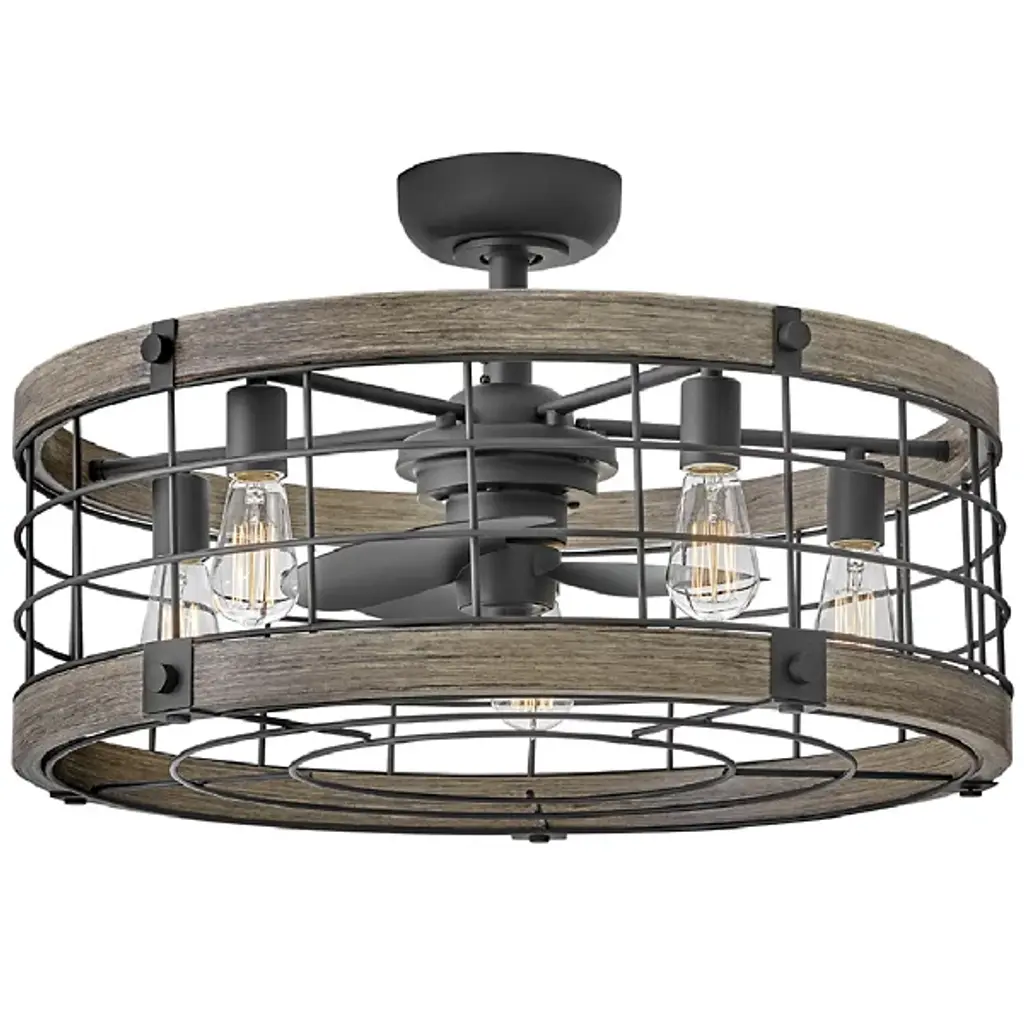 Nostalgic in style, the Bryce Fandelier from Hinkley Lighting washes the room with a sense of ease through its circulating blades and circling light source. The piece blends rustic texture and an industrial cage structure for a personality-rich display. This structure puts in clear view the efficient blades inside that send out a generous breeze at three separate speeds. The bulbs outlining the blades evoke a simpler time in their clear filamented design. The bulbs produce a textural visual and a soothing golden glow.
